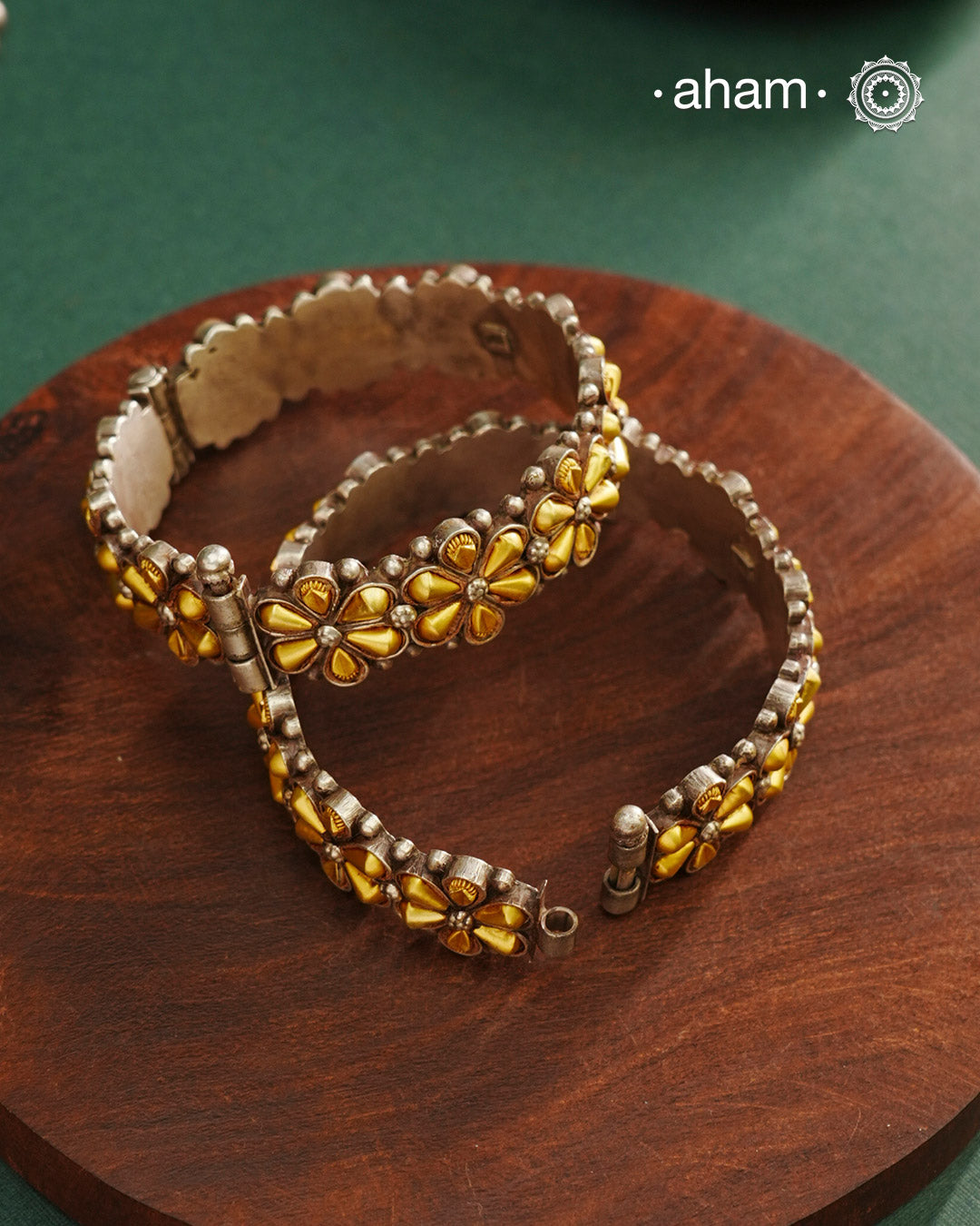 Enhance your style with the timeless elegance of the Dual Tone Silver Kadas. Handcrafted by skilled karigars in Barmer, Rajasthan, this earring features traditional Bandhel work, where a thin sheet of hand beaten 22 carat gold is fused with 92.5 silver and then set on 92.5 silver using a unique wax filling technique. A classic representation of Indian craftsmanship.