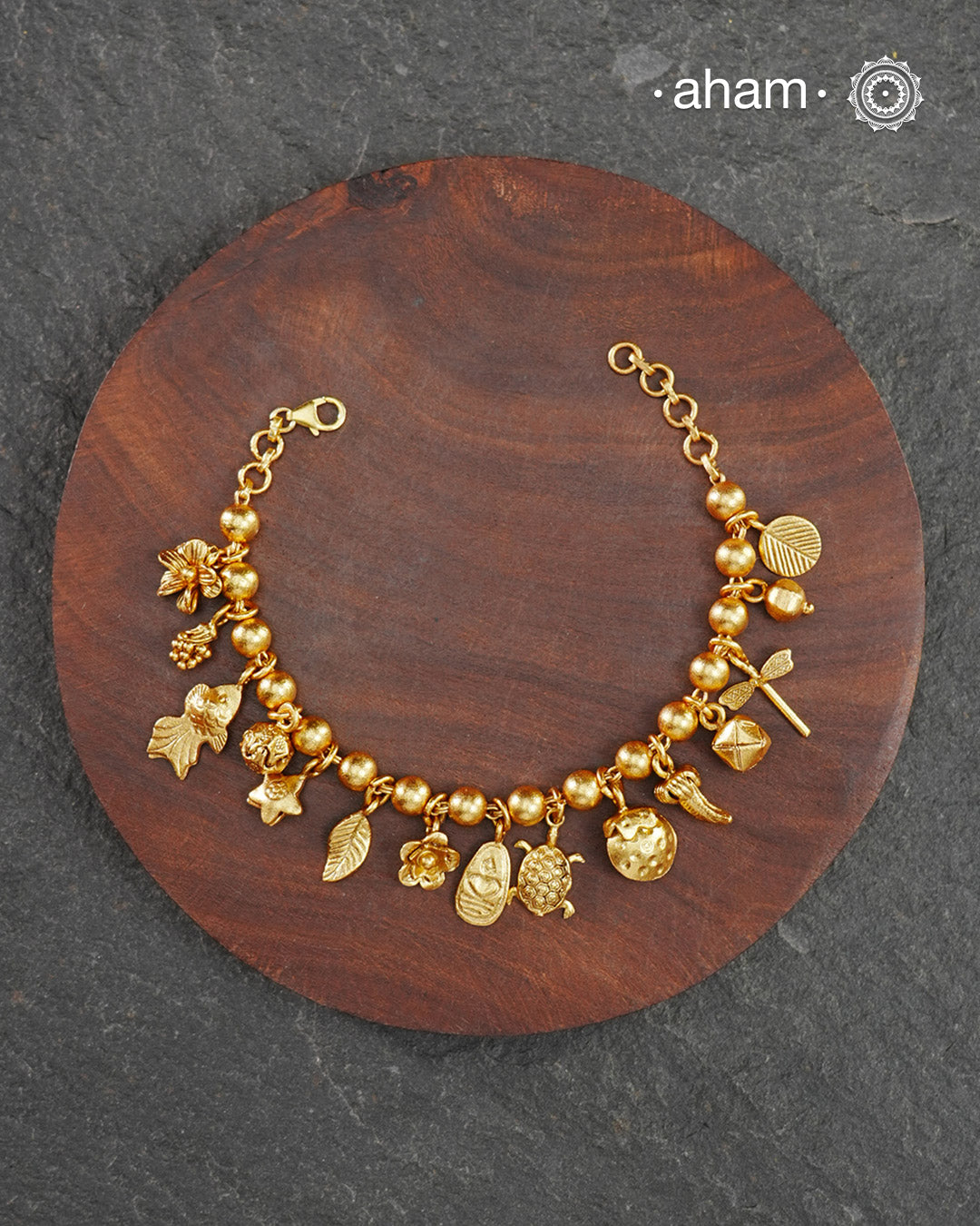 Up your wrist game with the A.M P.M Silver bracelet! 15 beautiful distinct charms all crafted in 92.5 silver with gold polish come together to make this piece. Whether worn at day or night, this bracelet is Perfect for adding a playful touch to any outfit.