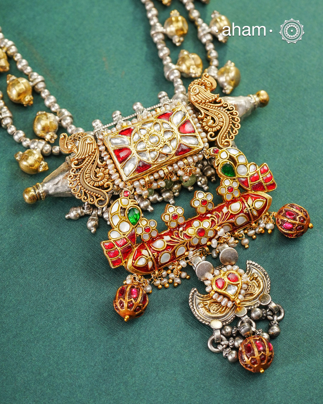 One of a kind statement wearable art pieces. An eclectic mix of elements, with a play of colours, textures, forms and workmanship. Crafted in Silver with two tones and kundan highlights and beautiful cultured pearls that makes this neckpiece so versatile and unique. Modern Heirloom pieces that can be worn across generations.