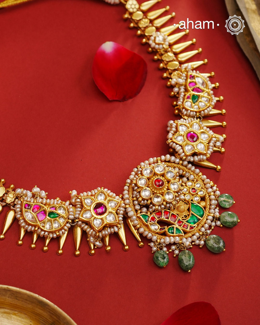 Expertly crafted for your special days, the Kundan Gold Polish Silver Neckpiece is a timeless addition to your wedding ensemble. Made with 92.5 silver and adorned with intricate kundan and pearl work, this neckpiece adds a touch of elegance to any outfit. Elevate your style with this exquisite piece.