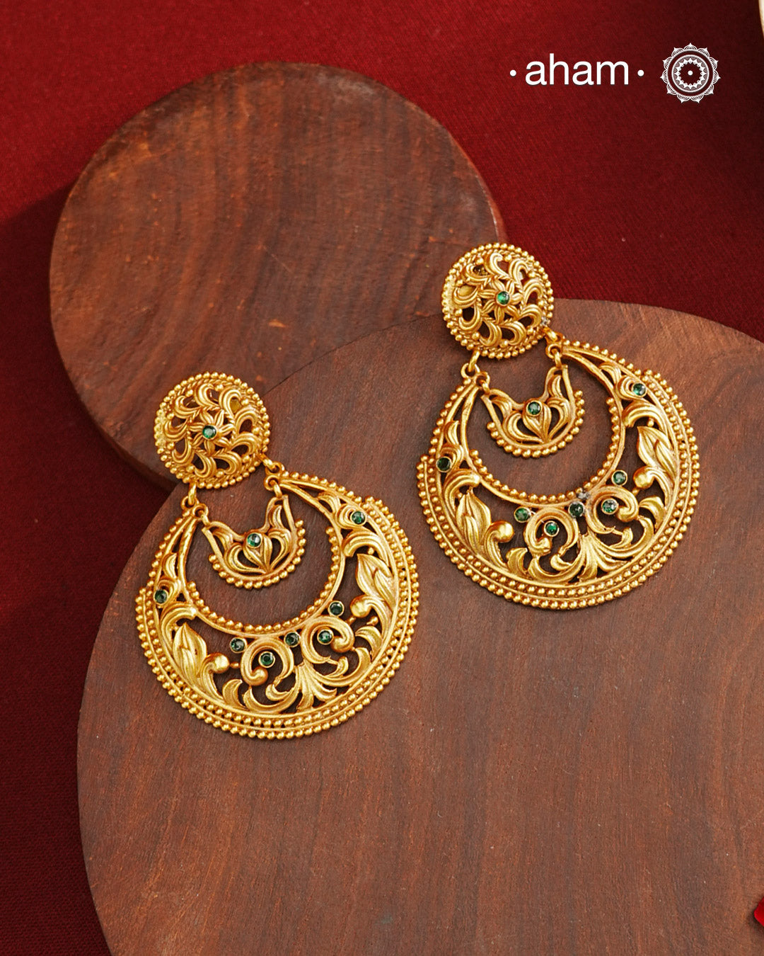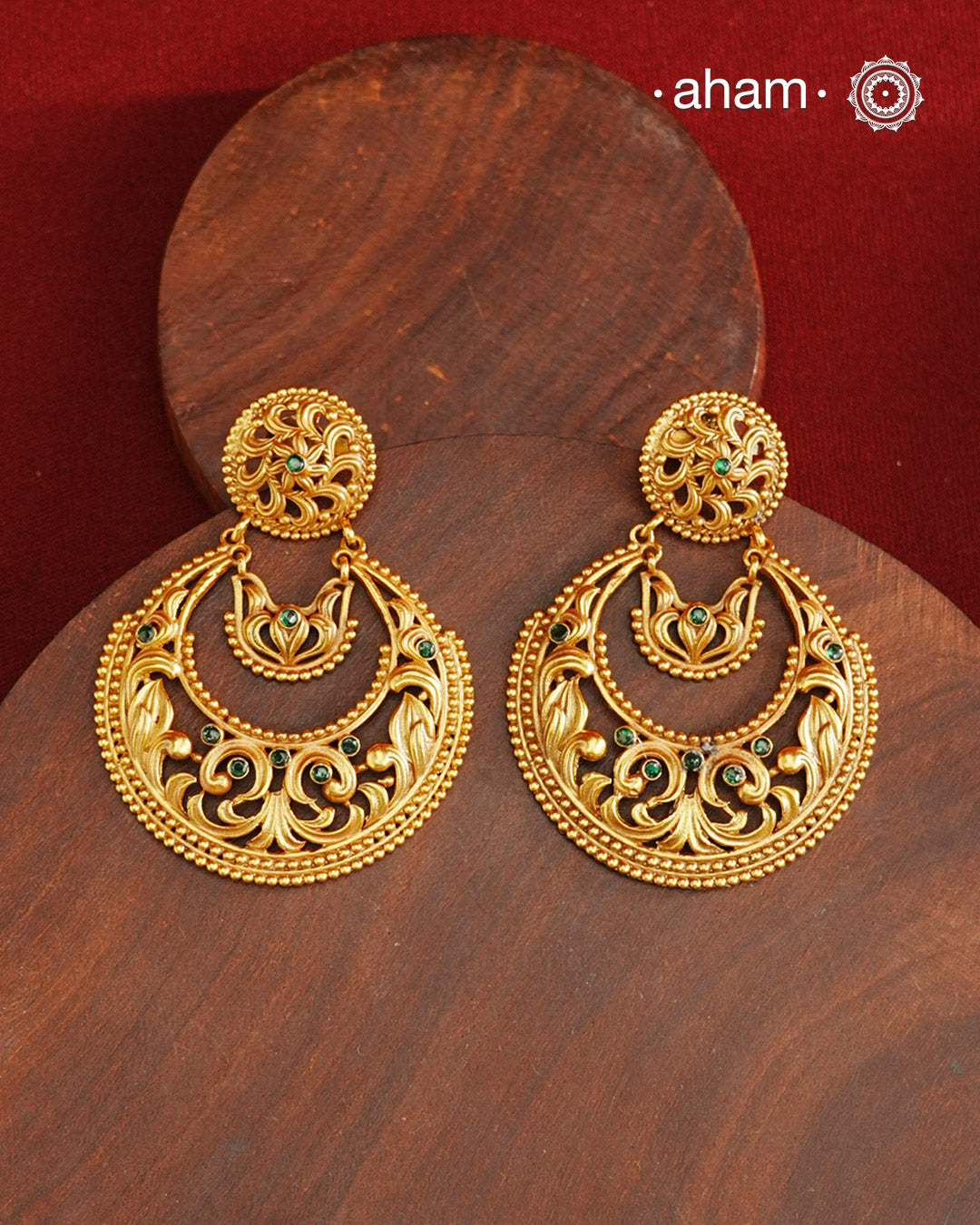 These Gold Polish Silver Chandbali Earrings showcase intricate rava and filigree craftsmanship, reflecting timeless traditional design. Crafted from 92.5% sterling silver with a delicate gold polish, they offer enduring elegance suitable for generations. Their classic style ensures they remain a fashionable choice for any occasion.