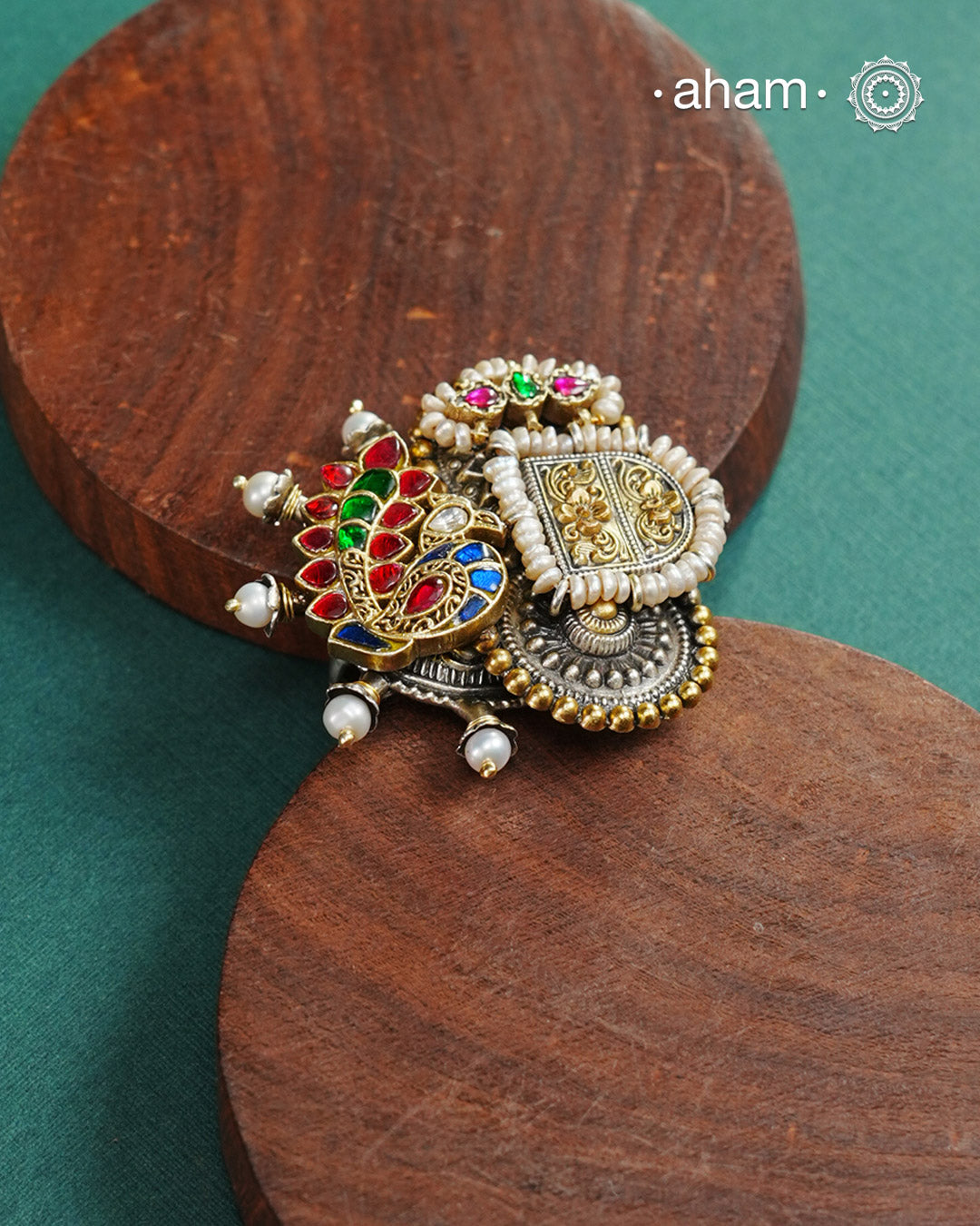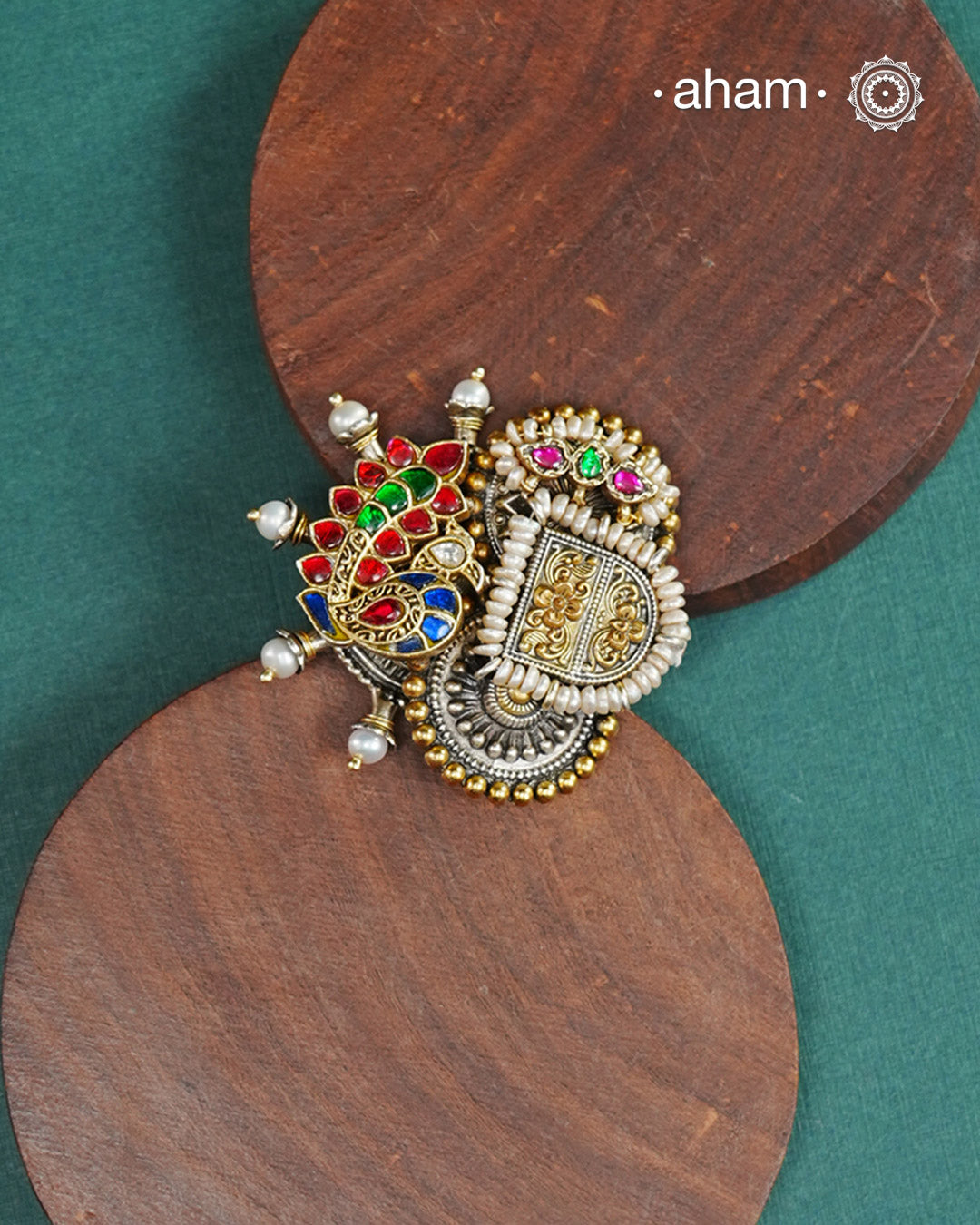 Noori two tone adjustable ring handcraftedin 92.5 sterling silver with hints of gold polish, pearls and kundan work. Perfect to match your Indian or fusion outfit.