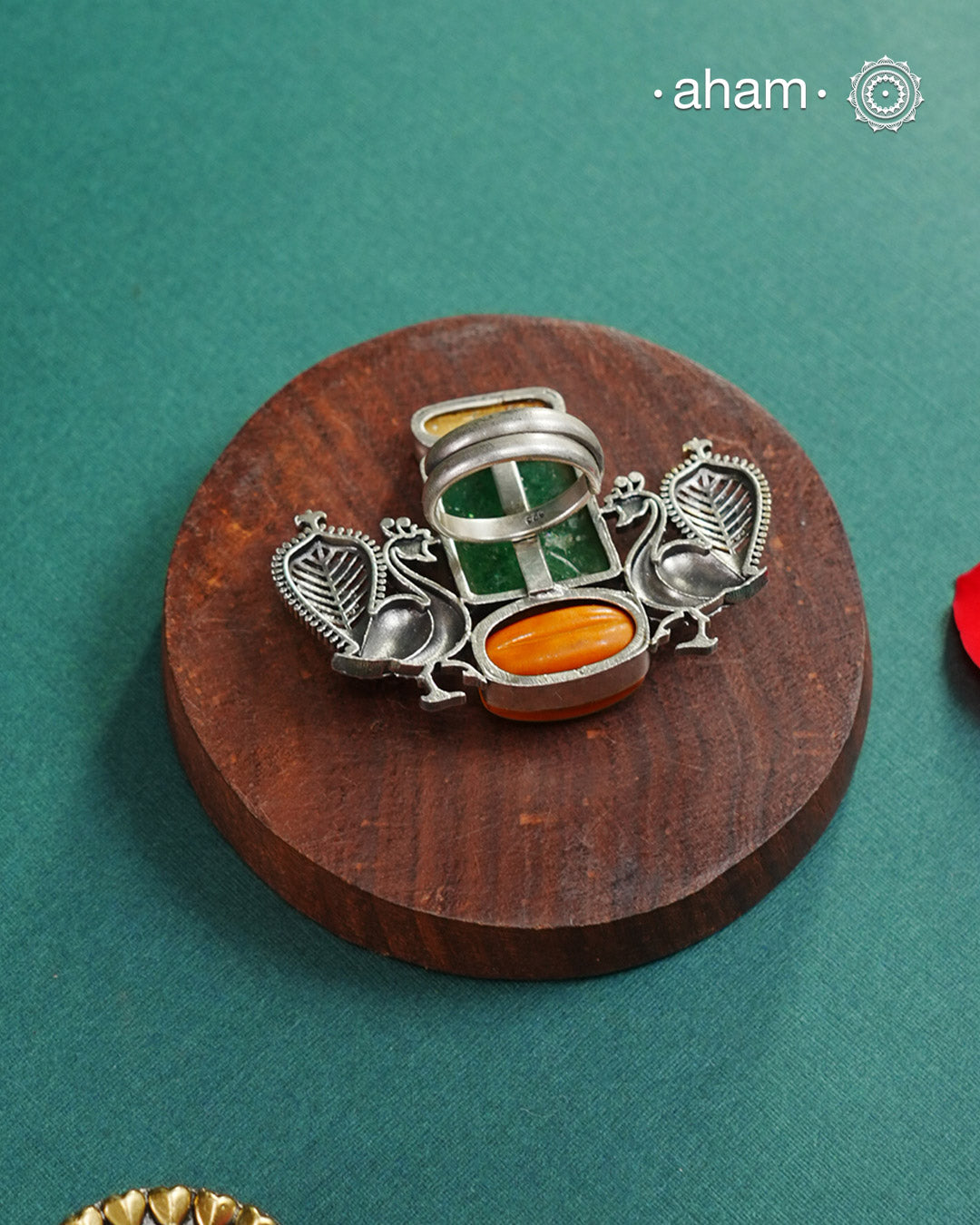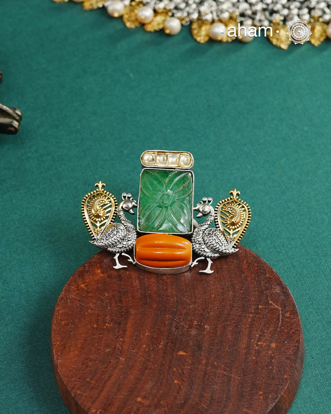 Noori two tone adjustable ring handcrafted in 92.5 sterling silver with hints of gold polish, and green carved stone and coral highlight. Perfect to match your Indian or fusion outfit.