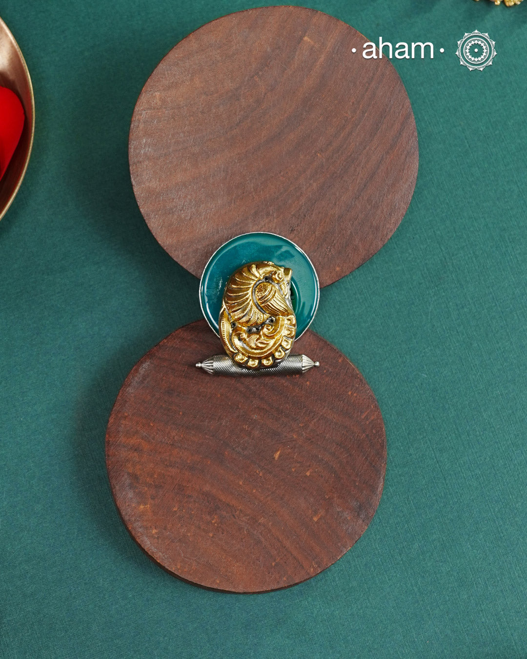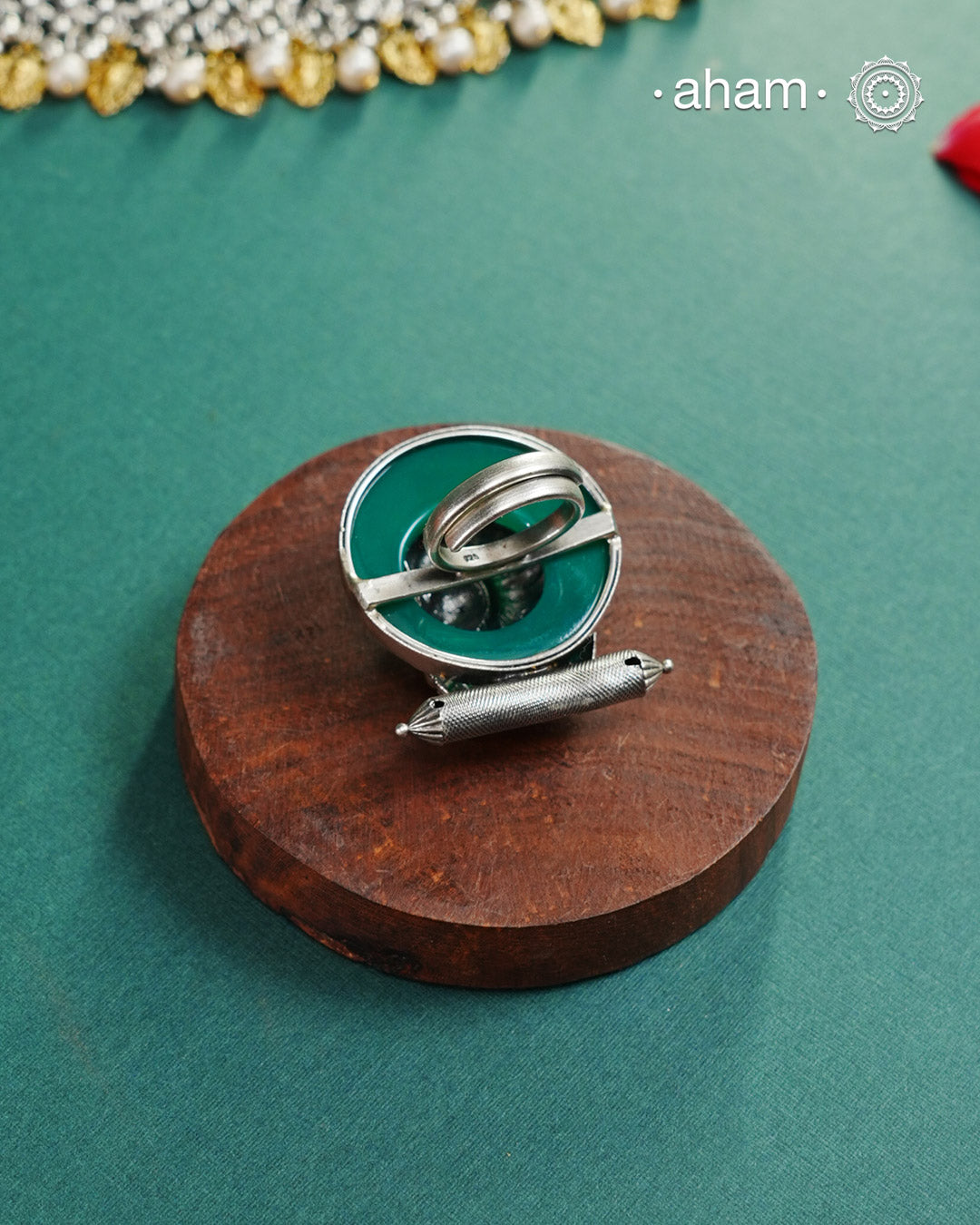 Noori two tone silver ring, with beautiful green stone cased in 92.5 silver with peacock set on top.  Perfect to match your Indian or fusion outfit.