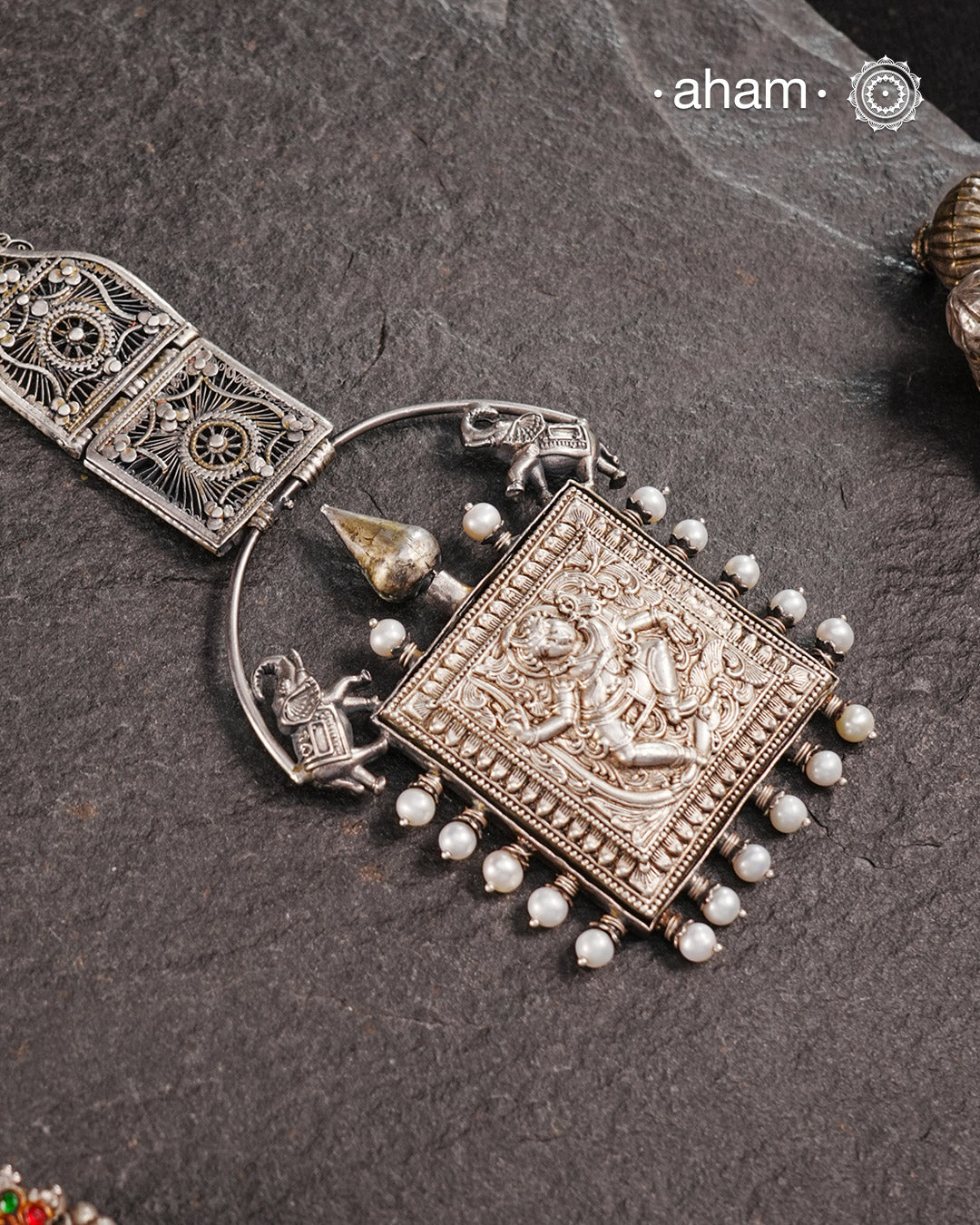This one-of-a-kind Silver Neckpiece features a striking Krishna centerpiece paired with a vintage Kerala belt accent, reflecting exquisite craftsmanship and cultural heritage. It is complemented by a smooth snake chain.  A distinguished addition to any collection.