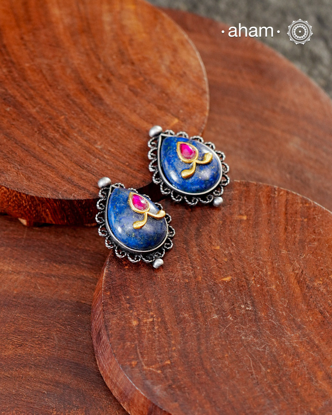 Handcrafted 92.5 Sterling Silver Earrings, Lapiz stone with inlay work.
