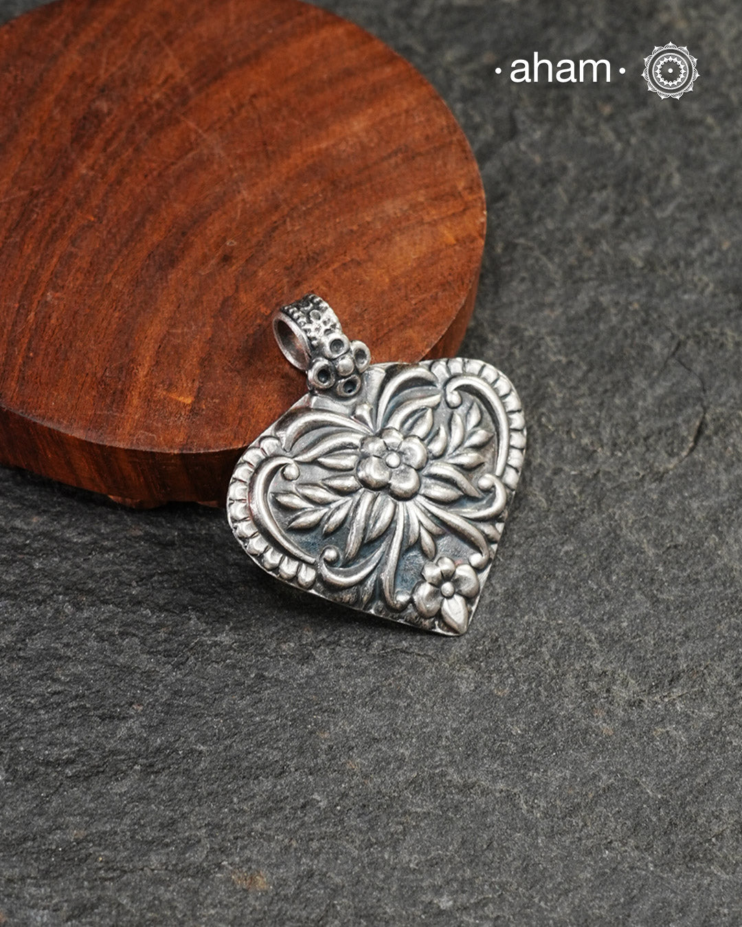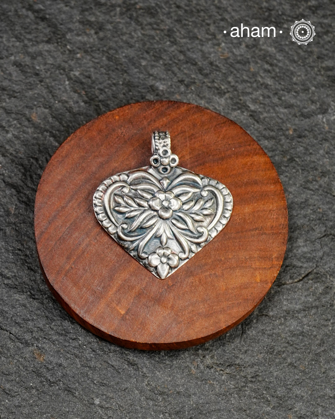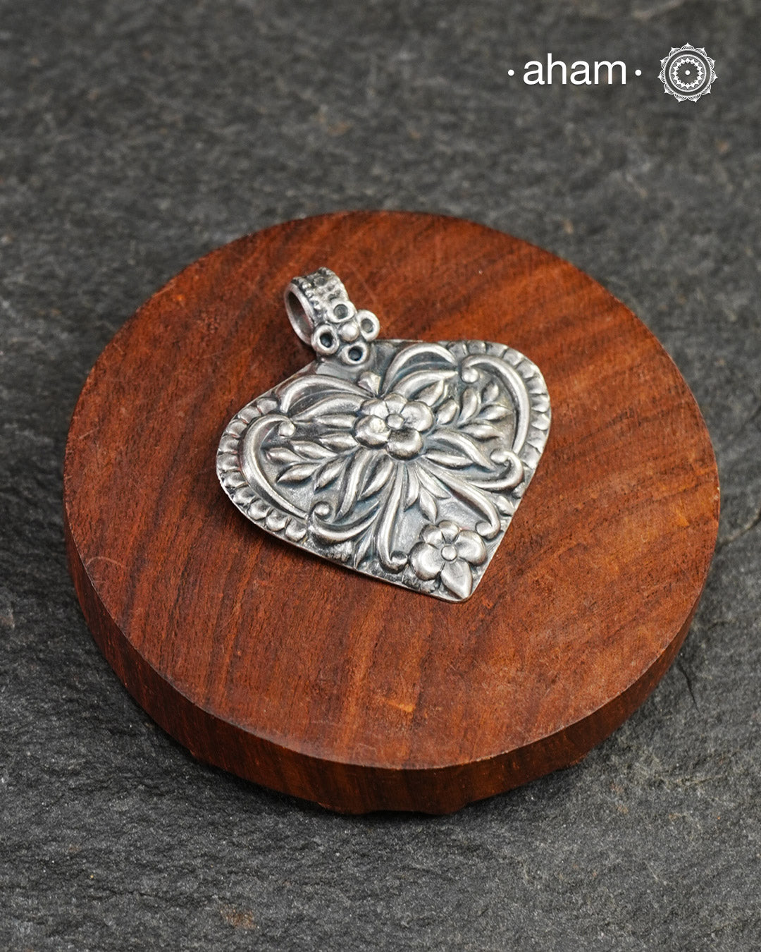 Mewad pendant in a leaf form, with beautiful detailing on it. Crafted in 92.5 silver. Light weight and easy to wear. Wear it with a black string or a thin chain.