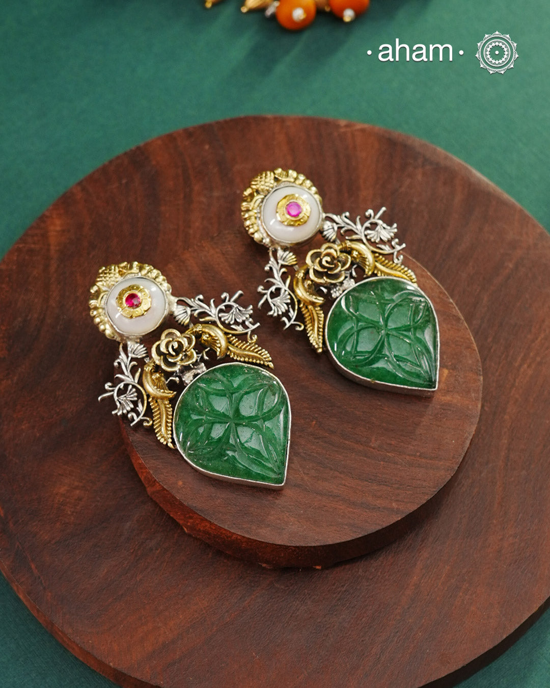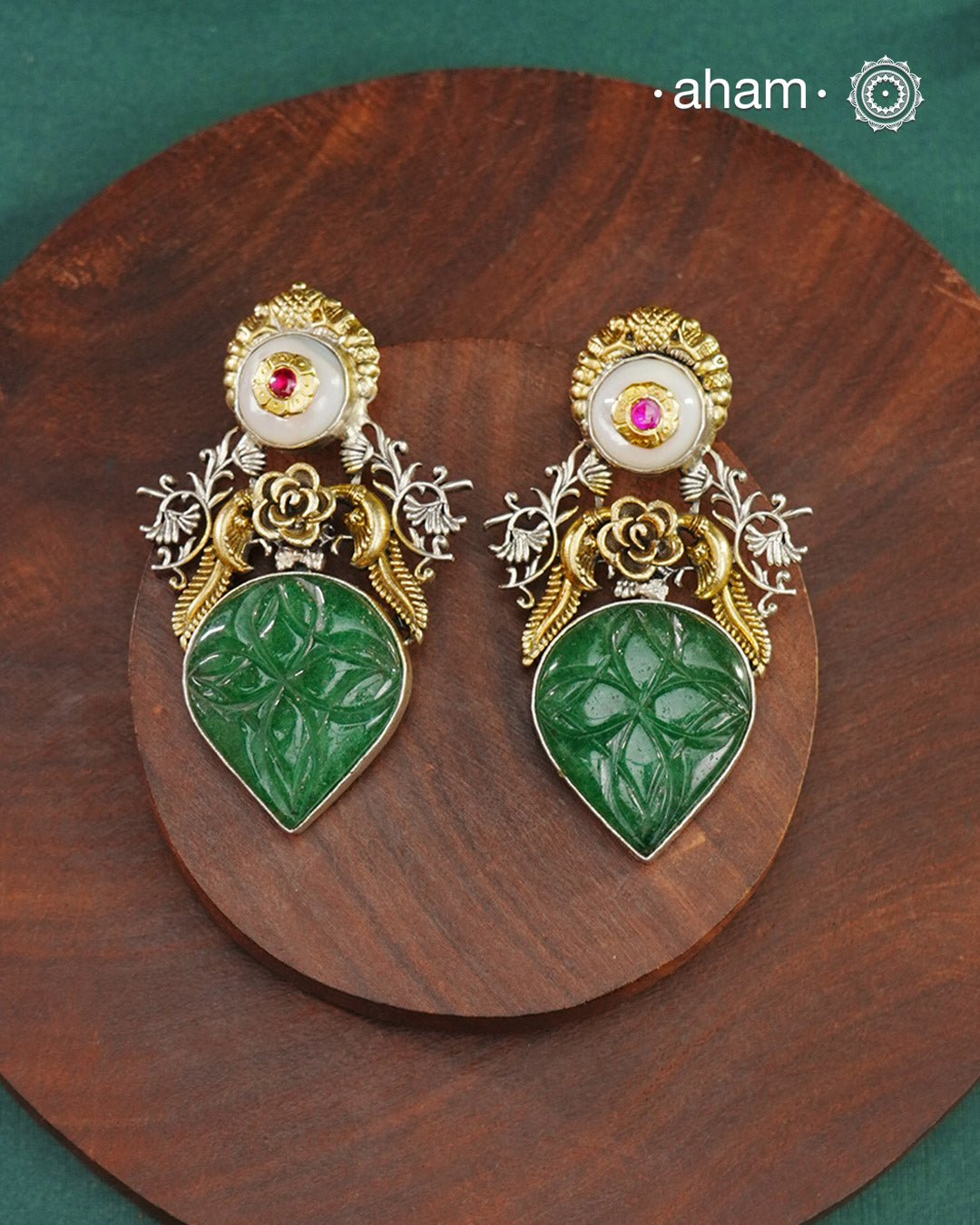 Noori two tone earrings are handcrafted in 92.5 sterling silver with kundan and gold highlights and carved green stone in the center. Style this one of a kind earring with your favourite ethnic or fusion outfits to complete the look.