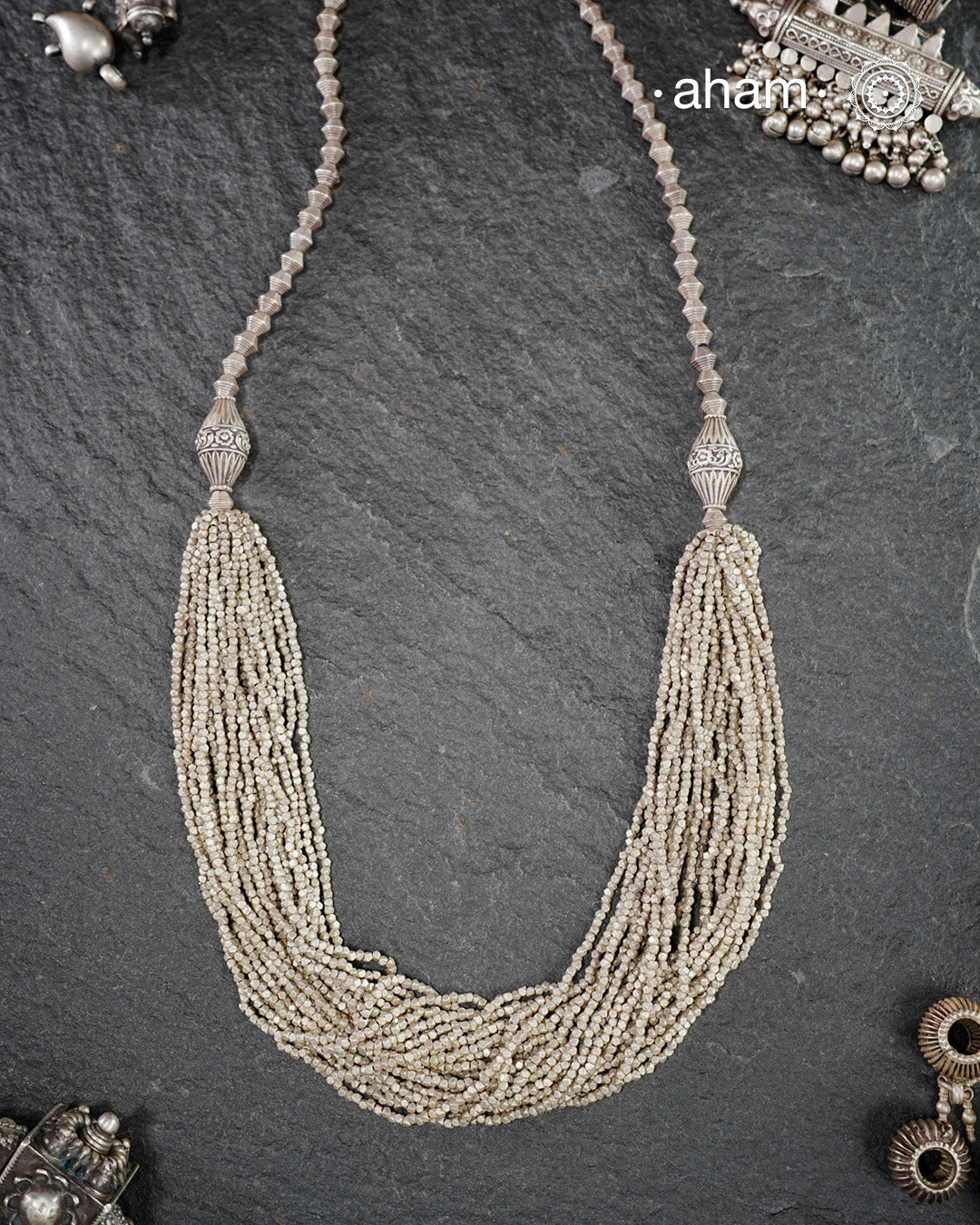 Featuring multiple strands of delicately crafted mustard/Sarsonshaped silver beads, this neckpiece reflects the cultural traditions of the Kutia Kondh tribals of Odisha, for whom these forms represent prosperity, fertility, and abundance.