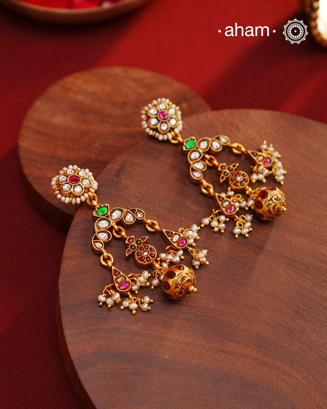 These Festive Gold Polish Silver Earrings feature traditional craftsmanship from South India in a modern design. Made with 92.5 silver, these earrings are adorned with kemp work and pearls, giving them a touch of elegance. Dipped in gold polish for added luster.
