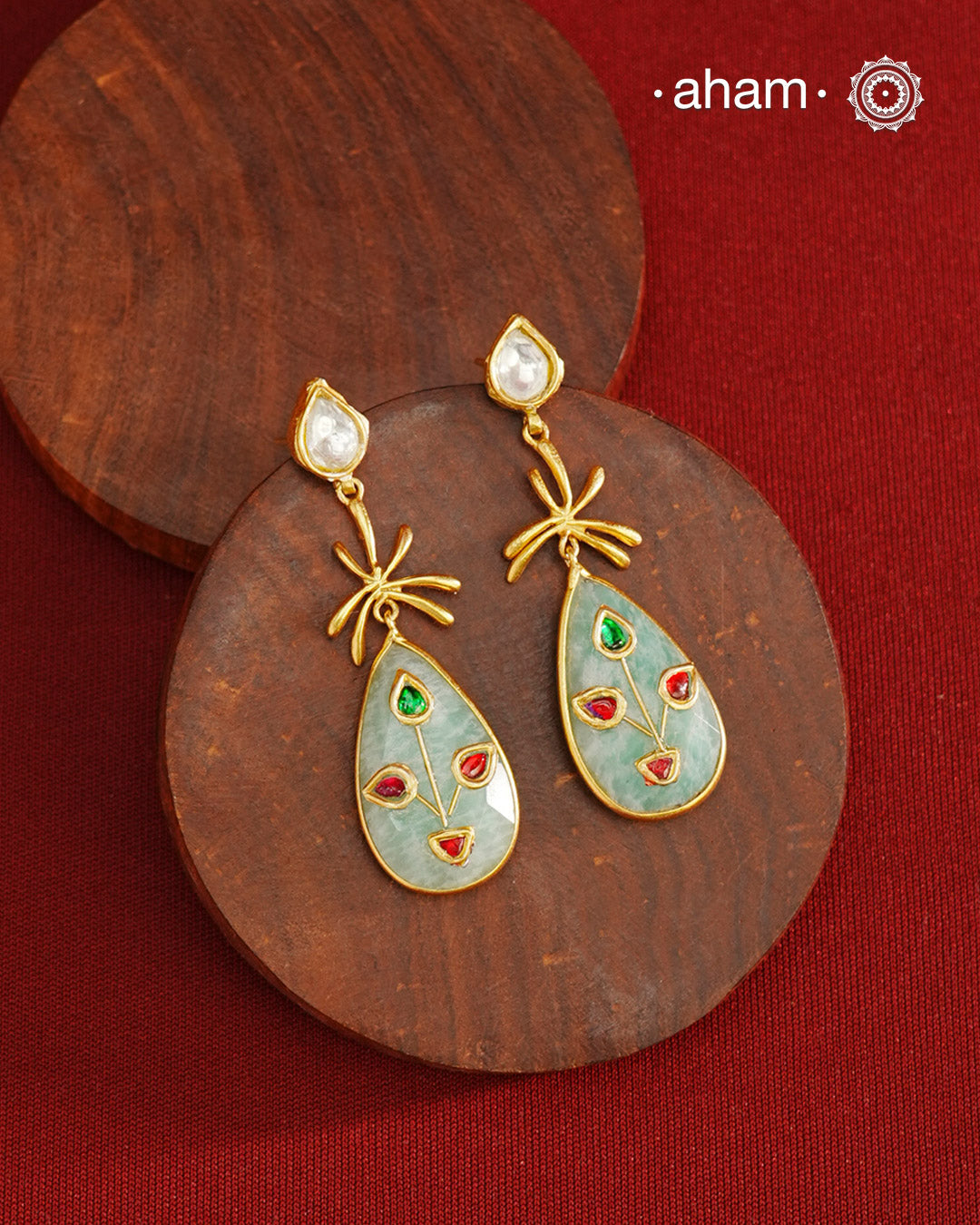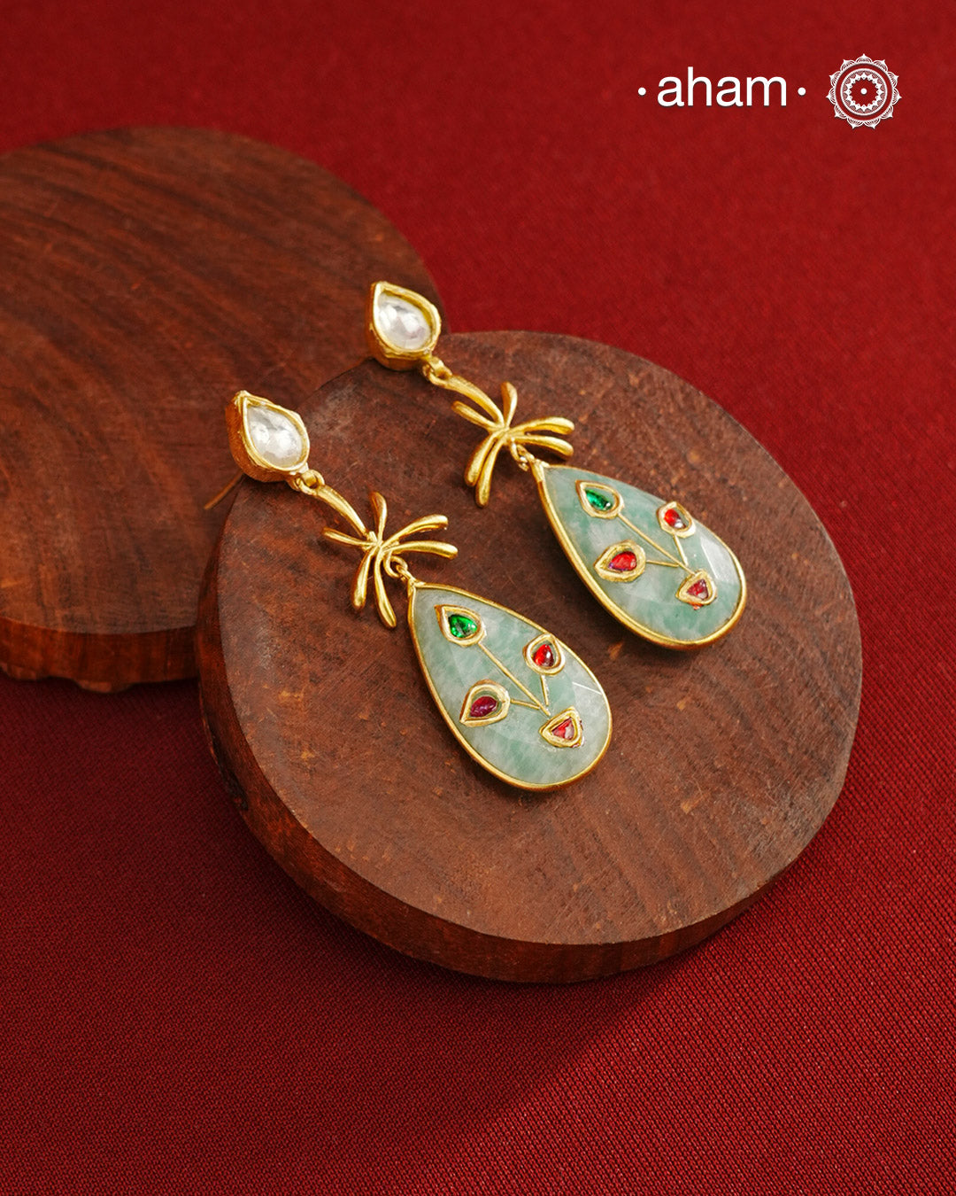 Gold Polish Silver Stone drop Earrings feature exquisite kundan inlay work, blending traditional craftsmanship with contemporary style. Perfectly suited for Indo-Western ensembles, they add a touch of elegance and sophistication to your look. Crafted with attention to detail, these earrings enhance your outfit making them a versatile accessory for special occasions.