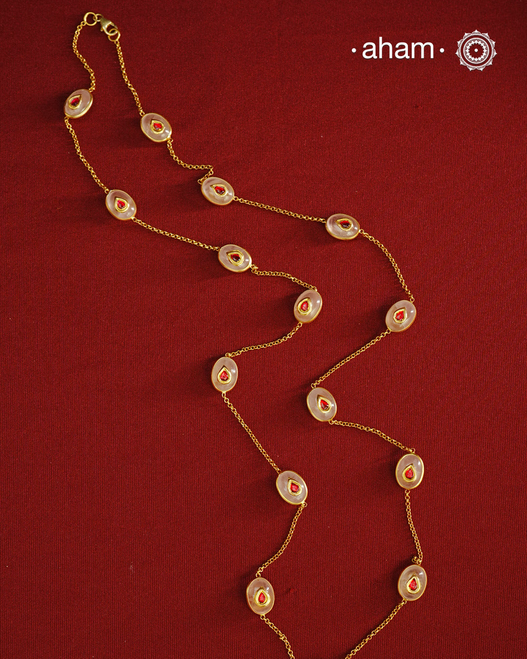 This handcrafted silver neckpiece features exquisite rose quartz and intricate kundan inlay work, enhanced with a refined gold polish. Designed for versatility, it can be worn as a single long line or doubled for a layered look, making it a sophisticated addition to any jewellery collection.