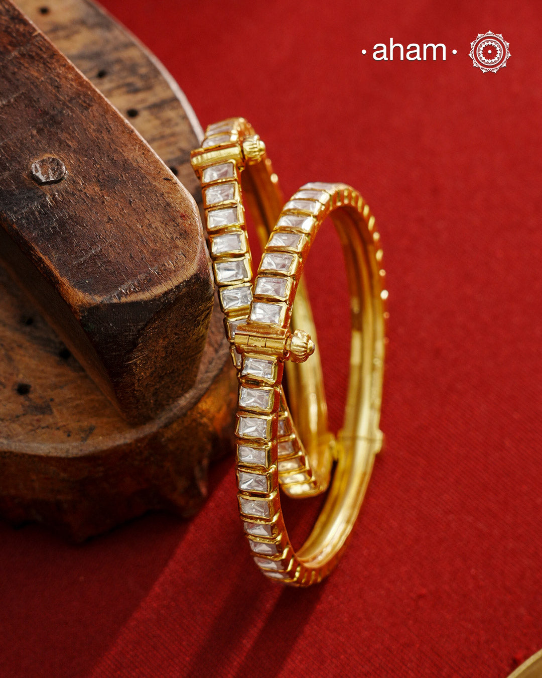 A set of 2 Moissanite kadas that are expertly crafted from 92.5% sterling silver with fine gold polish finish, showcasing a refined and elegant appearance. They are beautifully set with brilliant moissanite stones that closely mimic the sparkle of real diamonds, adding exceptional brilliance. The openable size 2.4 design offers a comfortable and adjustable fit, making this piece a sophisticated addition to any jewellery collection.