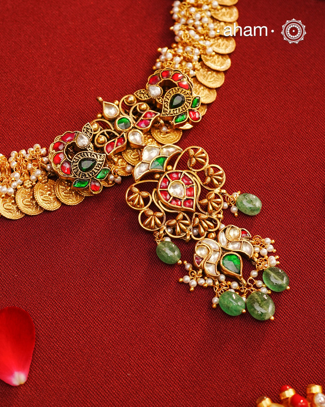 The classic kasu mala - coin neckpiece that never goes out of style. Crafted in 92.5 silver with gold polish. Exquisitely elegant, the heritage collection features traditional motifs and intricate  workmanship on gold-plated silver jewellery, a reflection of the rich culture of India. This collection is perfect for brides and bridesmaids.