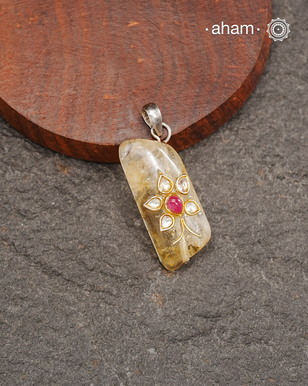 Citrine stone with inlay work silver pendant.Works great with work wear or even your evening dress.