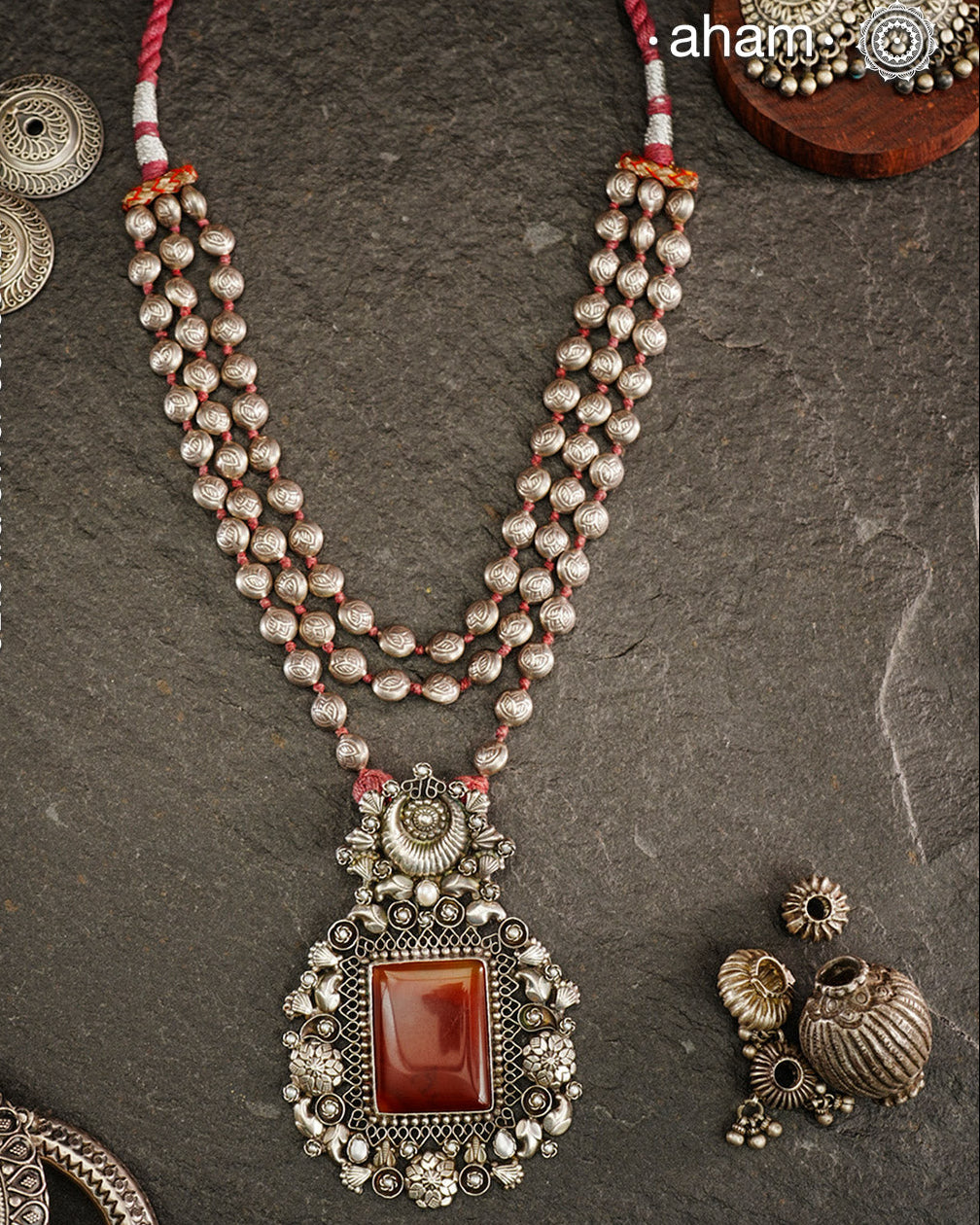 Exquisitely crafted Ira Silver Neckpiece featuring three elegant beaded lines that converge on a stunning pendant. The centerpiece showcases a rich carnelian coloured stone, meticulously surrounded by delicate pearl work, creating a harmonious balance of color and texture. This sophisticated design designed in 92.5 silver offers timeless appeal with a contemporary sensibility.