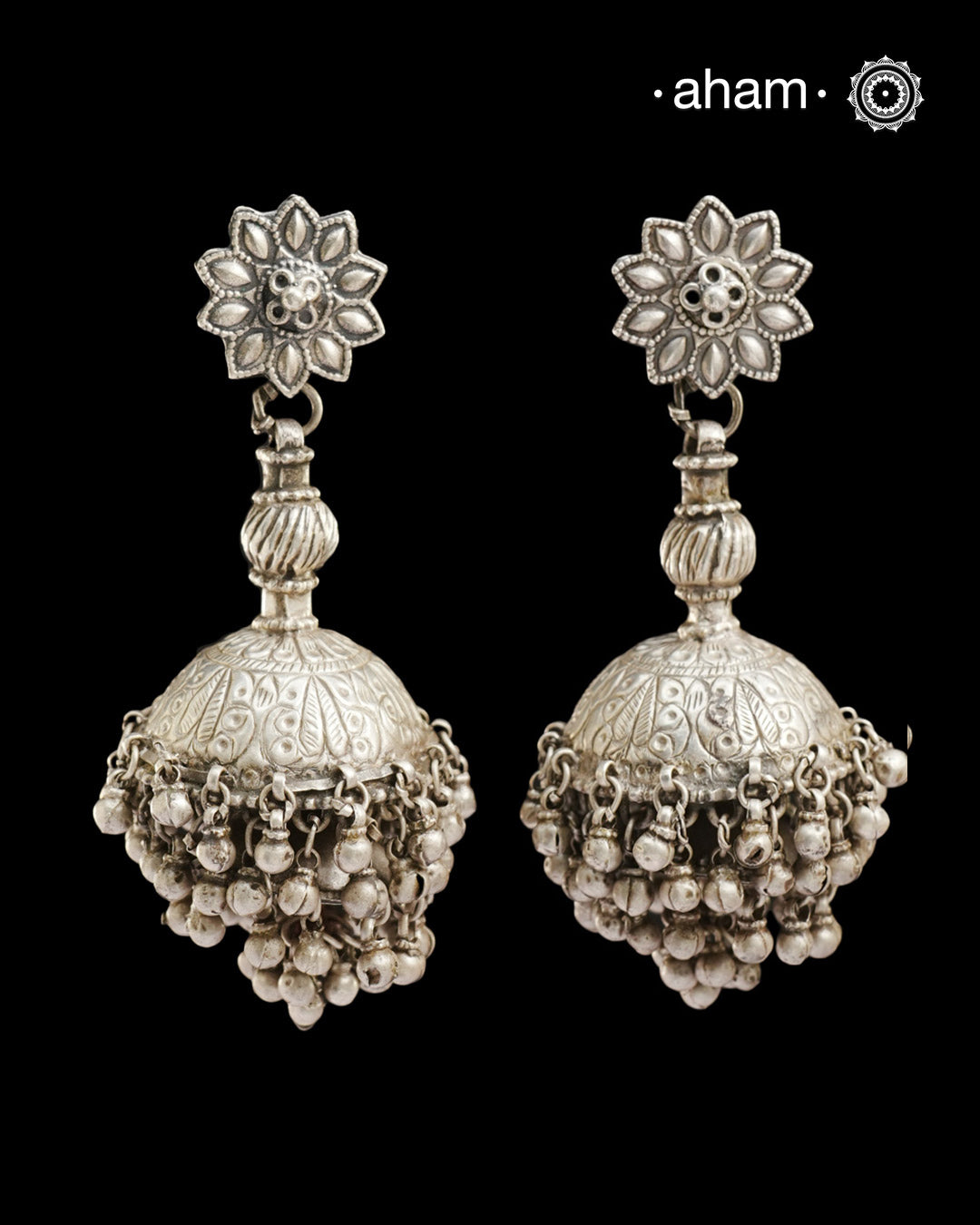 Statement Tribal Silver Jhumkie Earrings - These bold, handcrafted silver jhumkie earrings. The delicate ghungroos create a delightful sound with every movement, adding a playful yet traditional touch. Perfect for those who appreciate heritage jewellery wthese earrings are an eye-catching addition to any collection. Please note that the earrings are heavy and weigh around 122 grams