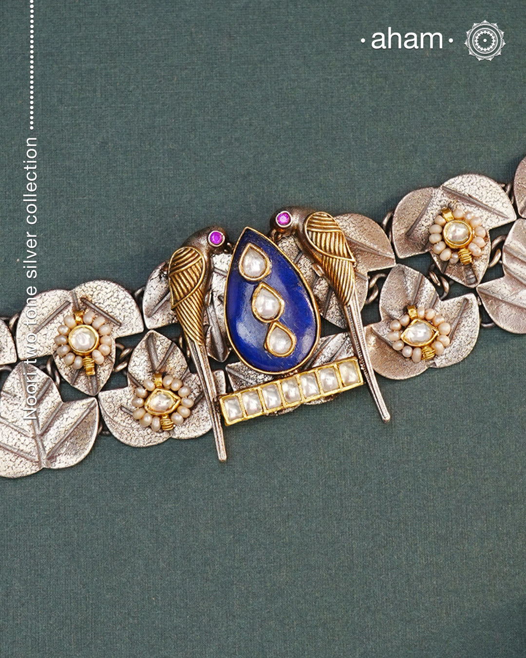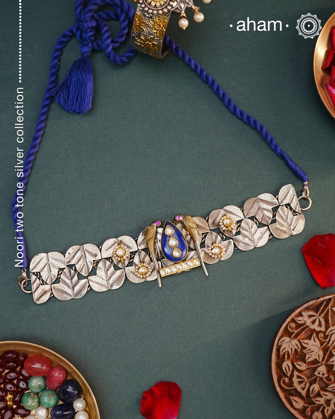 Discover the beauty of the Noori Two Tone Silver Choker. Simple yet unique, this wearable art piece is crafted in 92.5 silver with two tones and embellished with two parrots and lapiz at its center. With kundan and pearl highlights, this modern heirloom will be cherished for generations.