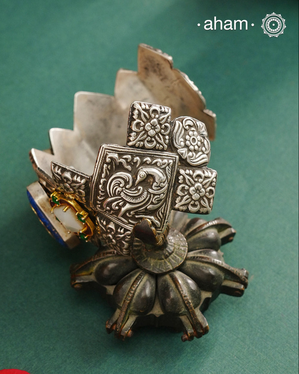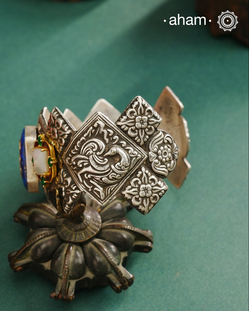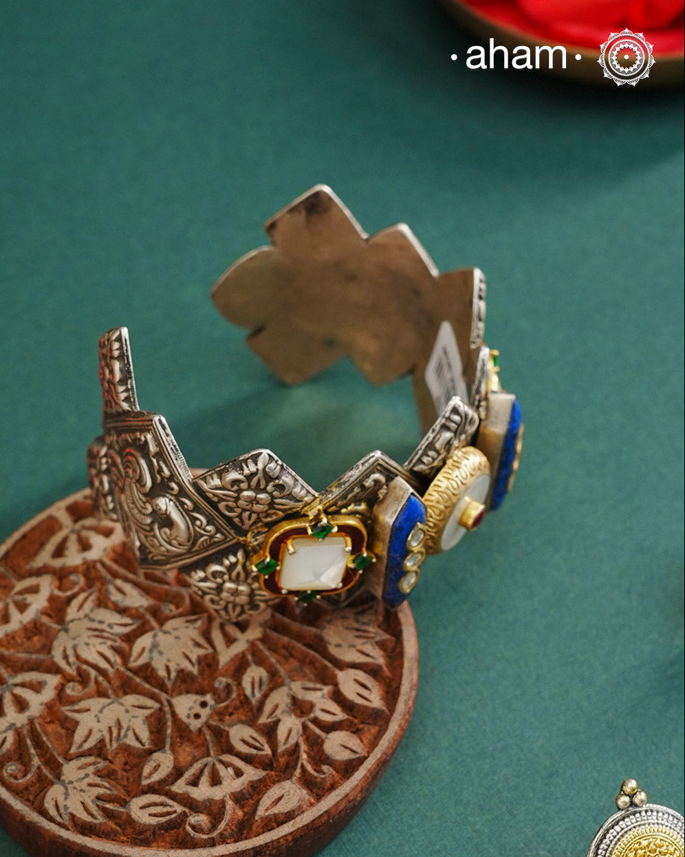 Noori hand cuff with a play of colours, textures, forms and workmanship. Crafted in 92.5 Sterling Silver with two tones that make them so versatile and unique. The price is for one piece kada only.