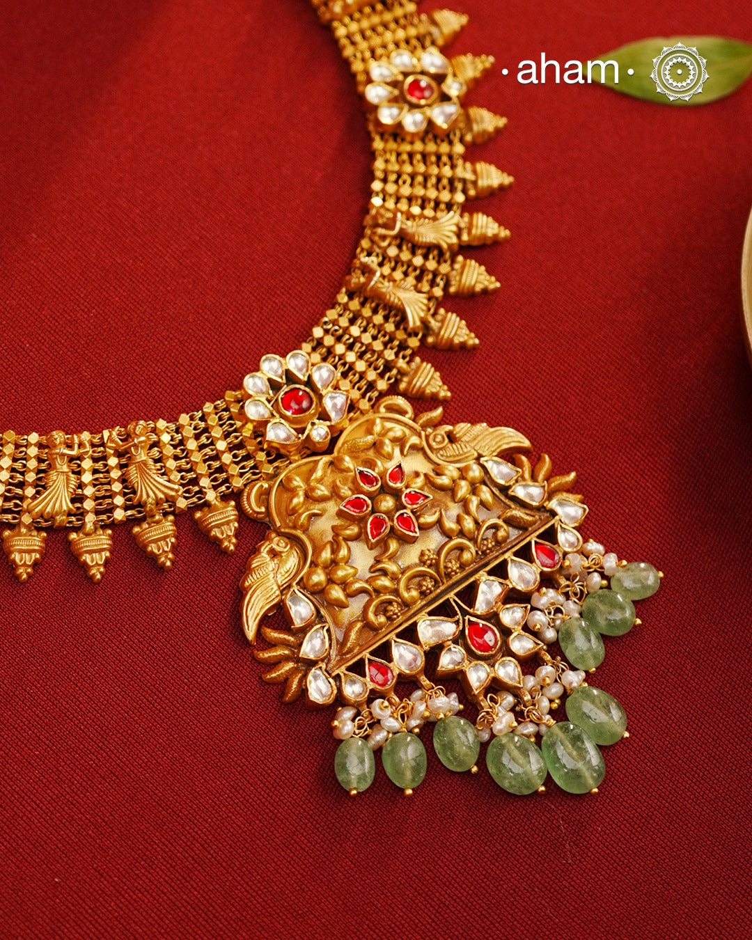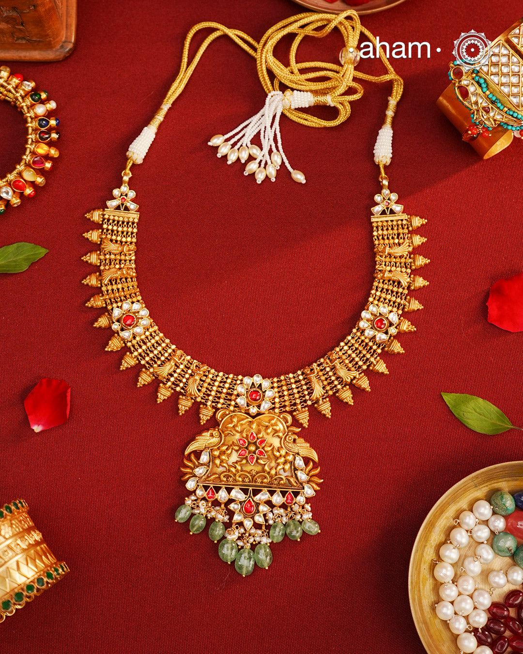This Kundan Pearl Gold Polish Silver Neckpiece & Earrings Set from our Heritage collection showcases intricate traditional designs, meticulously crafted in 92.5 silver with a stunning gold polish and exquisite kundan work. Perfect for modern brides seeking a touch of timeless elegance.