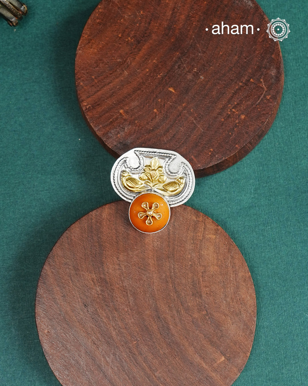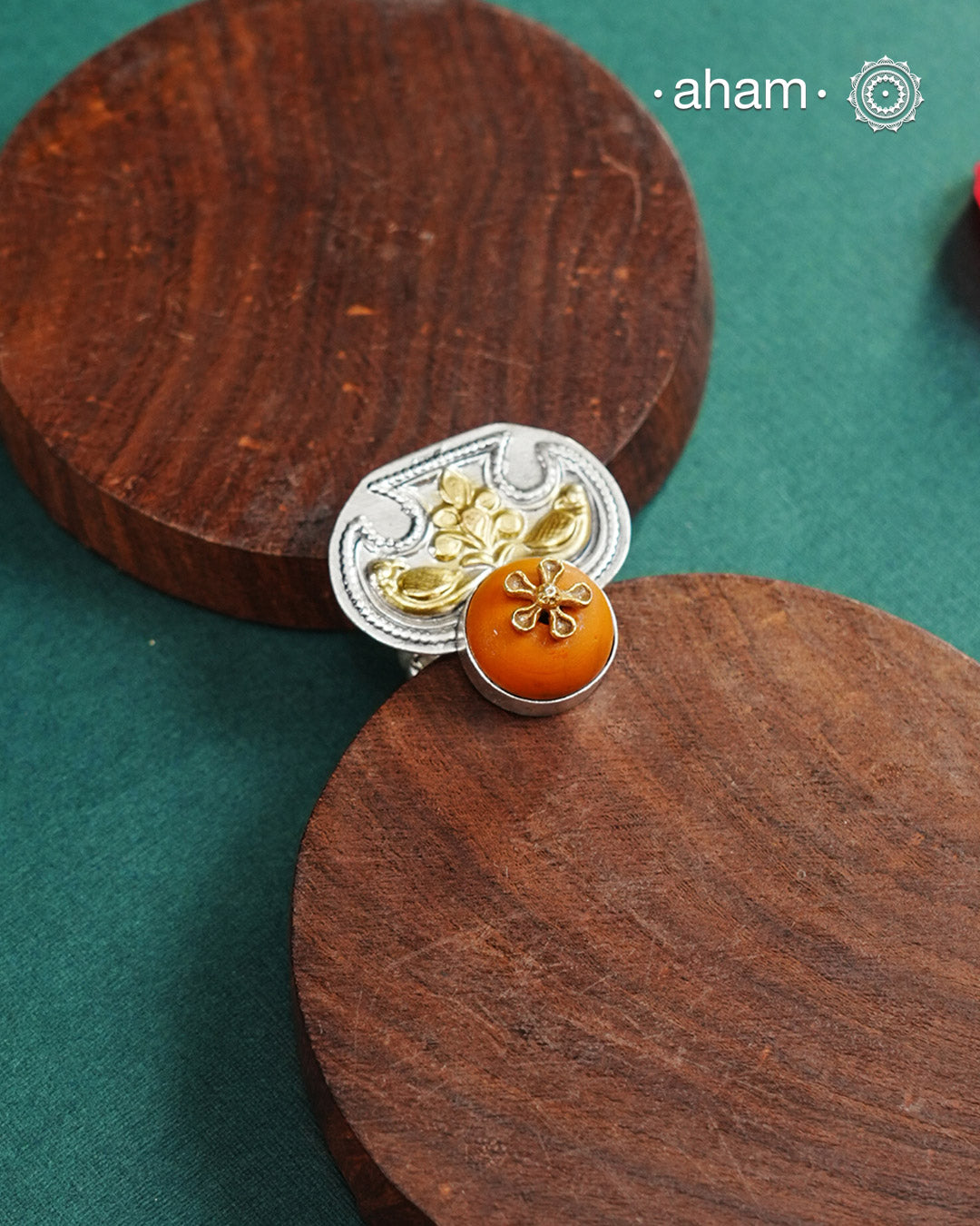 Noori two tone adjustable ring handcrafted in 92.5 sterling silver with hints of gold polish and faux coral highlight. Perfect to match your Indian or fusion outfit.