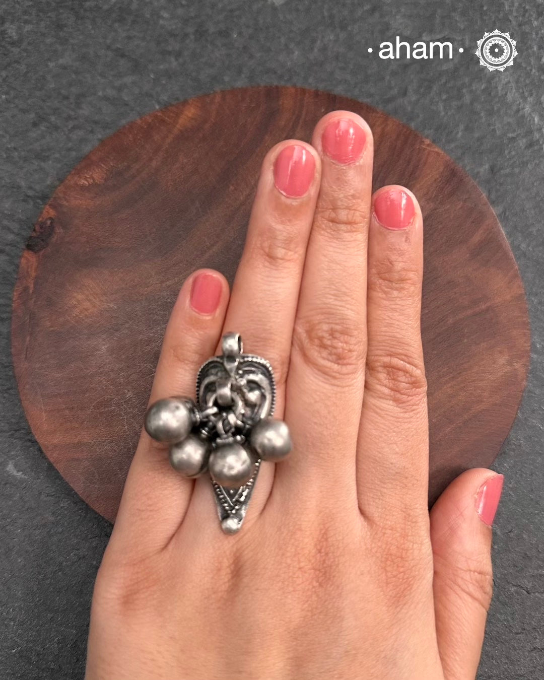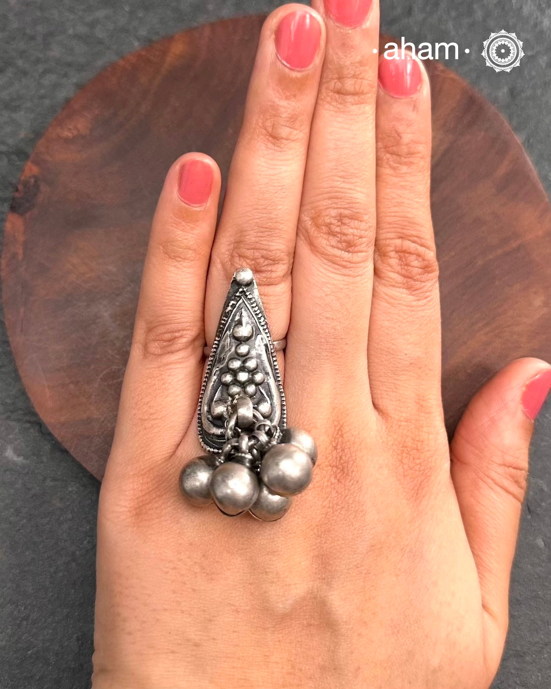 Tribal silver adjustable ring with a bunch of ghungroos.Perfect to pair with your ethnic clothing.