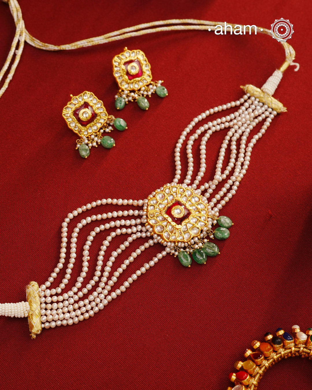 Adorn yourself with this breathtaking Kundan Gold Polish Silver Choker Set. Crafted from 92.5 sterling silver with stunning kundan detailing, the set features cultured pearls for a beautiful, royal feel. Style with any traditional outfit for an elegant look.
