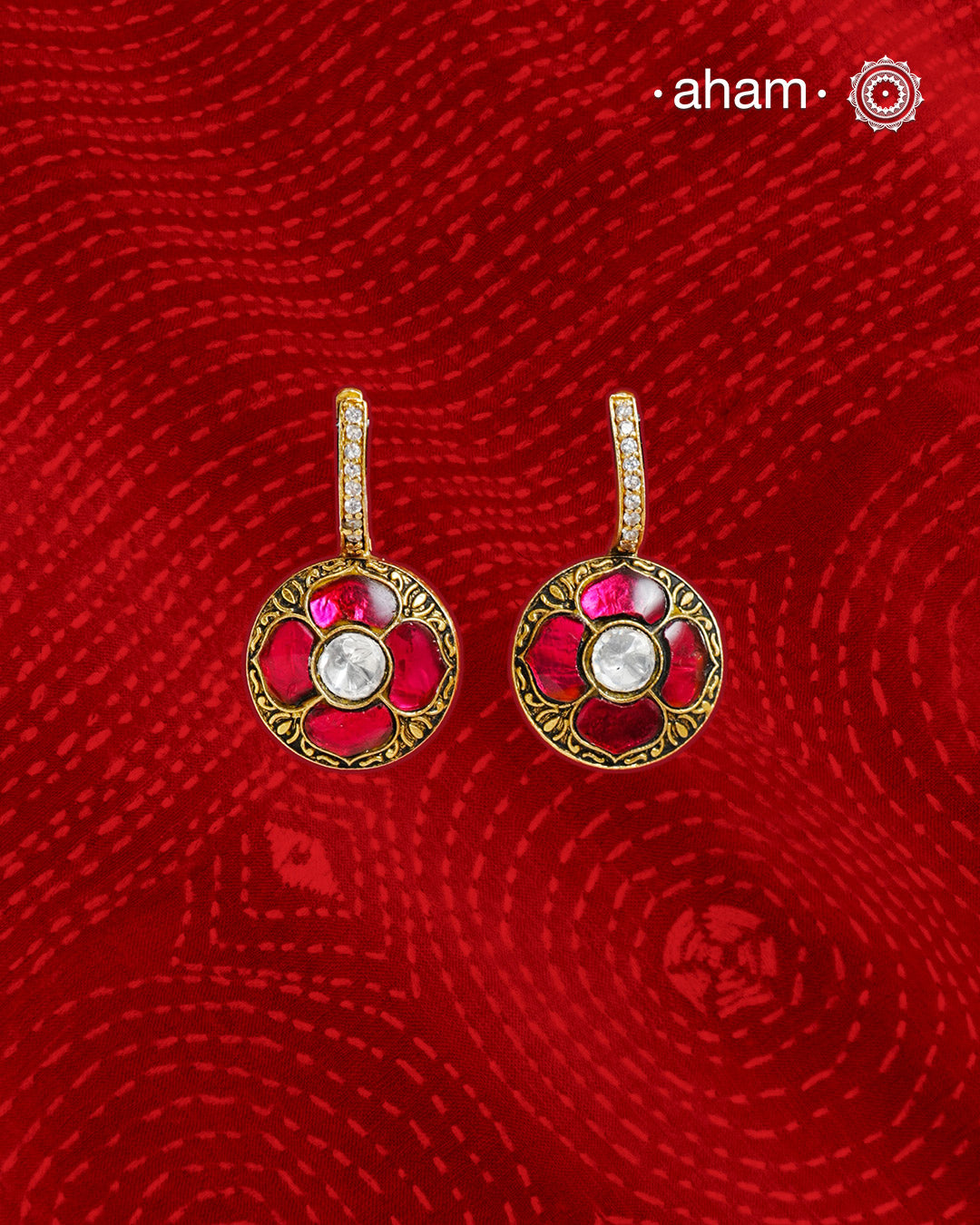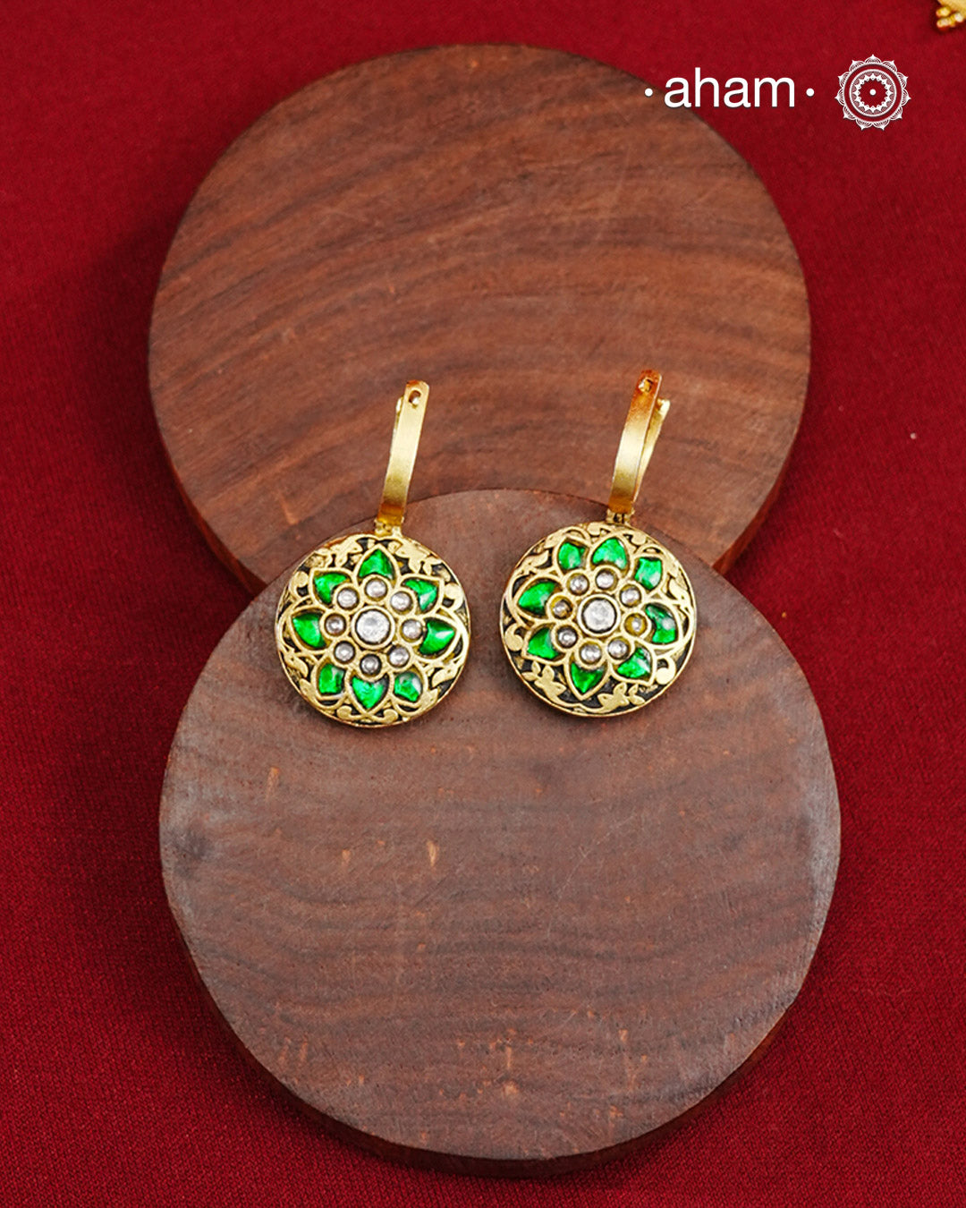 These two-sided hoop earrings combine classic elegance with contemporary design. Made from 92.5% silver and finished with a fine gold polish, they showcase red kundan stones on one side and green kundan on the other. This dual-sided feature offers versatile styling options, complementing a wide range of Indian attire. Expertly crafted, these earrings deliver both quality and adaptability for sophisticated everyday or festive wear.