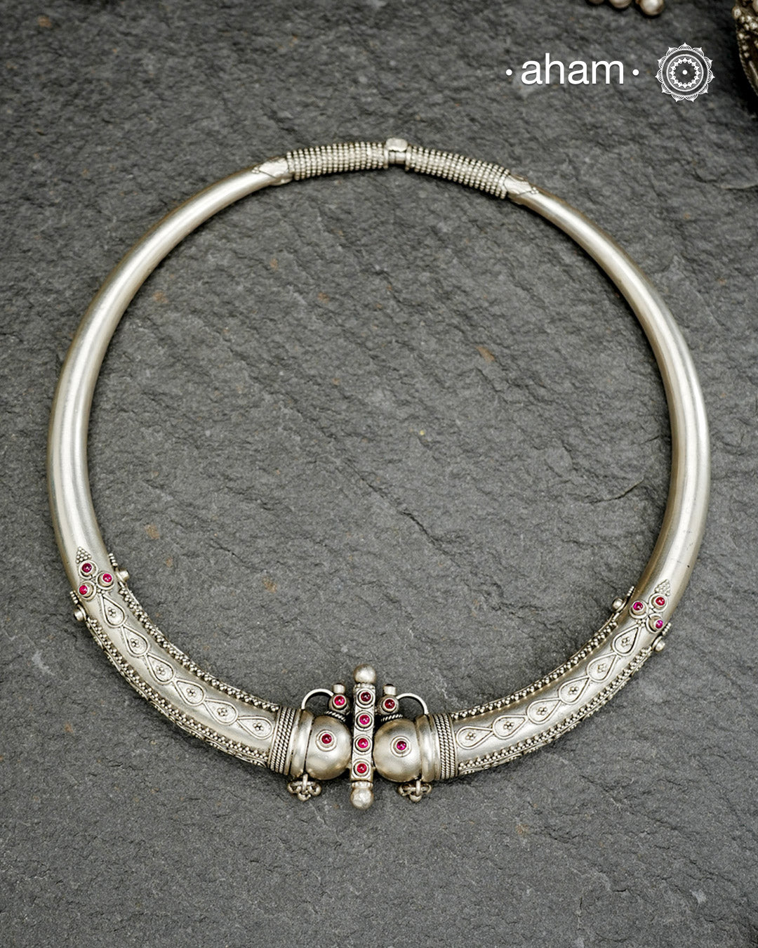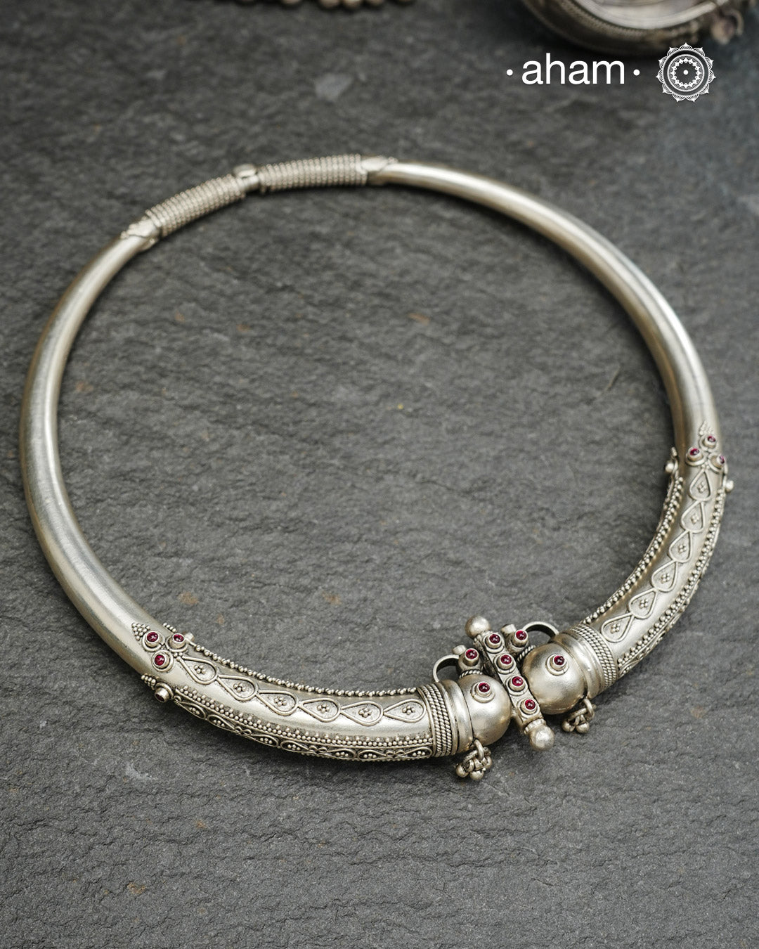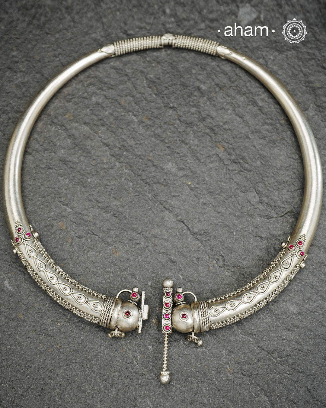 Mewad Silver Hasli crafted in 92.5 sterling silver, featuring exquisite rava and tar work that showcases traditional artisanal techniques. This reversible piece displays identical intricate detailing on both sides, allowing you to wear it according to your preference. The meticulous handwork reflects the heritage of Mewad craftsmanship, making it a versatile addition to your jewellery collection that transitions seamlessly between occasions.