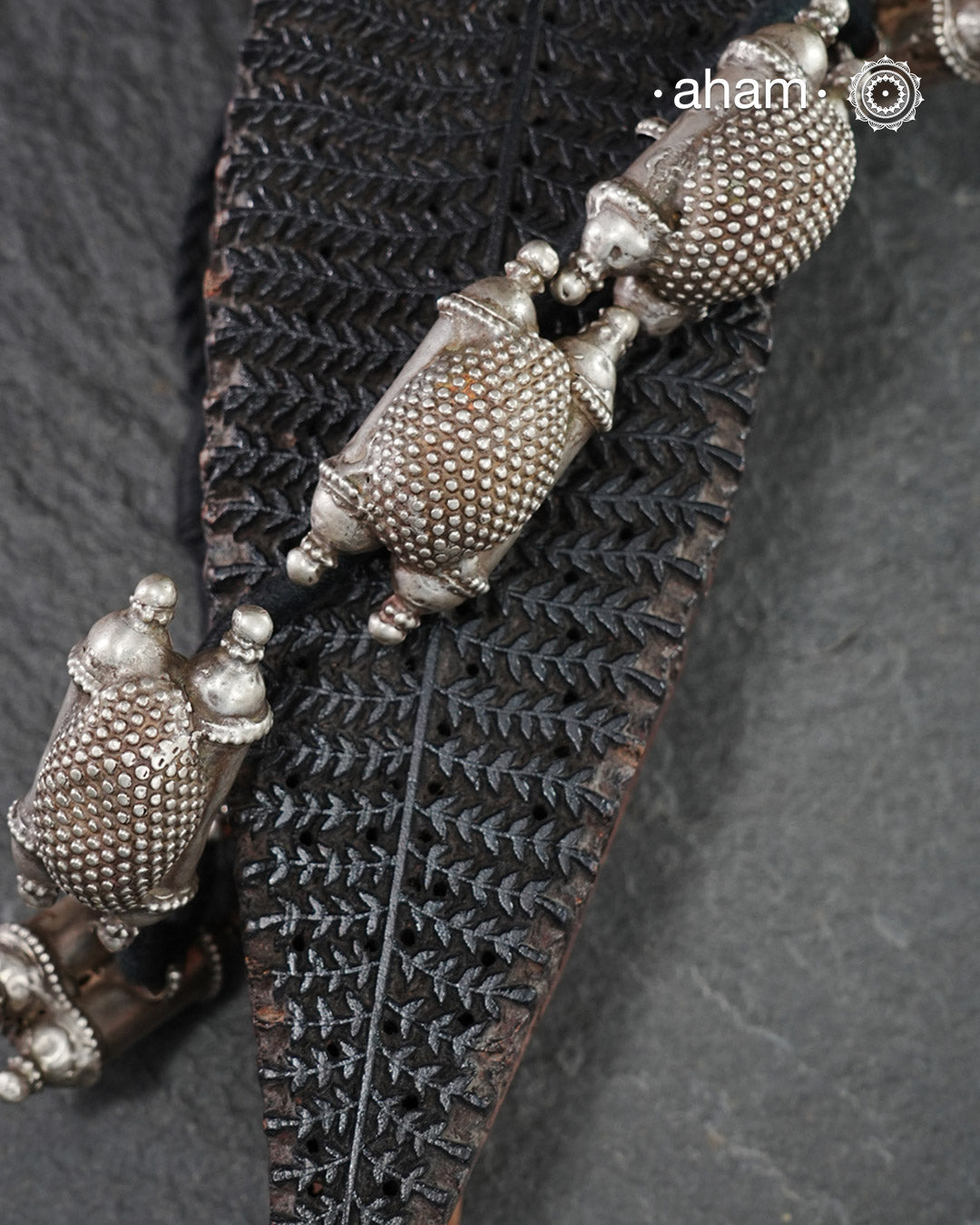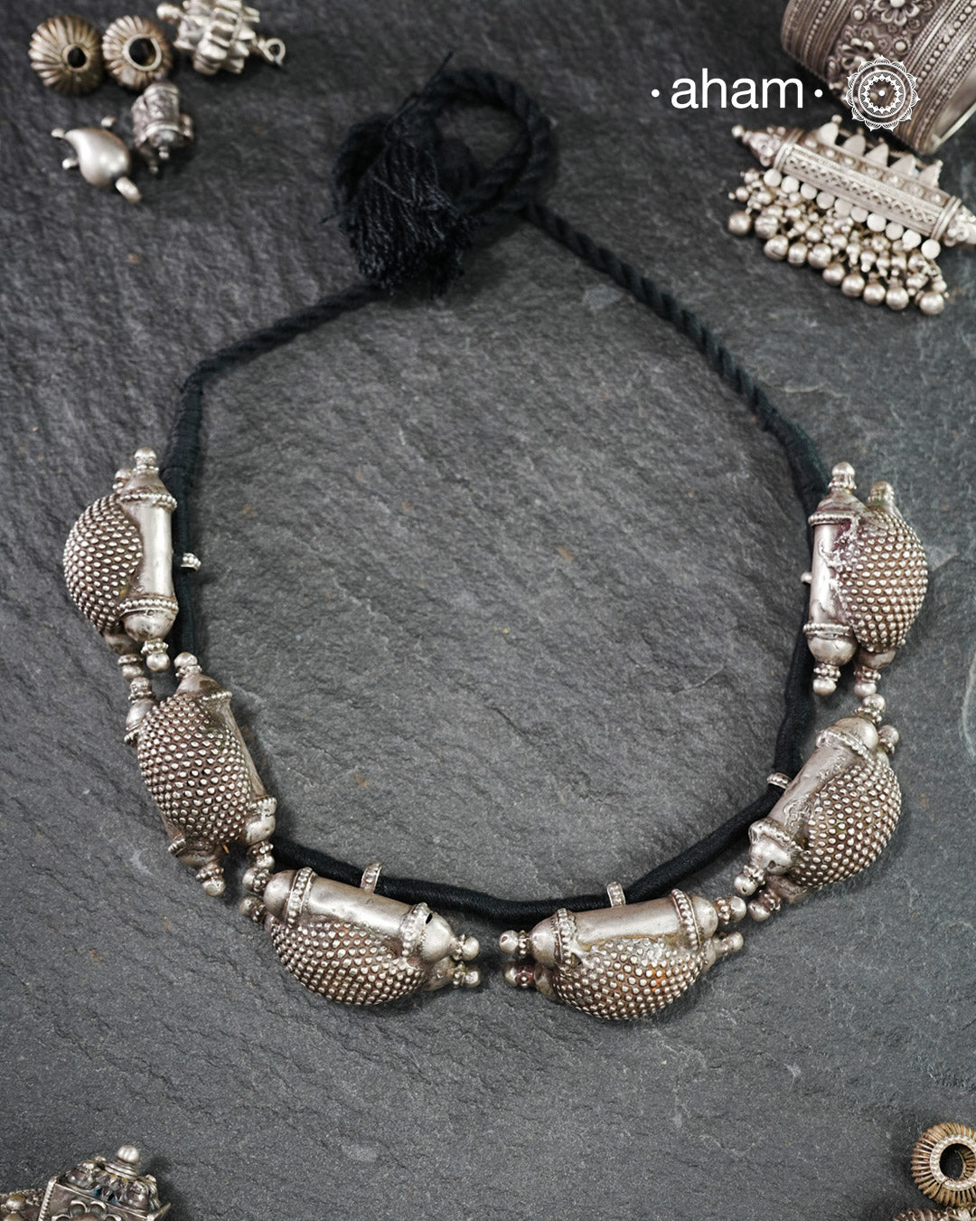 For those who enjoy and appreciate traditional tribal pieces, this one is for you. A beautiful statement neckpiece with chunky amulets threaded together on cotton string. A stunning piece this one is.