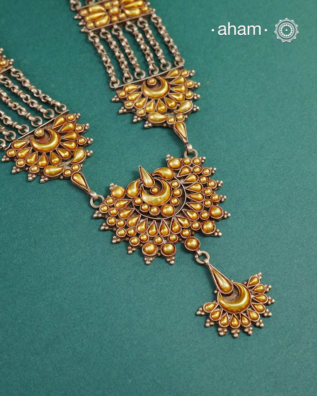 Enhance your style with the timeless elegance of the Dual Tone Silver Neckpiece. Handcrafted by skilled karigars in Barmer, Rajasthan, this earring features traditional Bandhel work, where a thin sheet of hand beaten 22 carat gold is fused with 92.5 silver and then set on 92.5 silver using a unique wax filling technique. A classic representation of Indian craftsmanship.