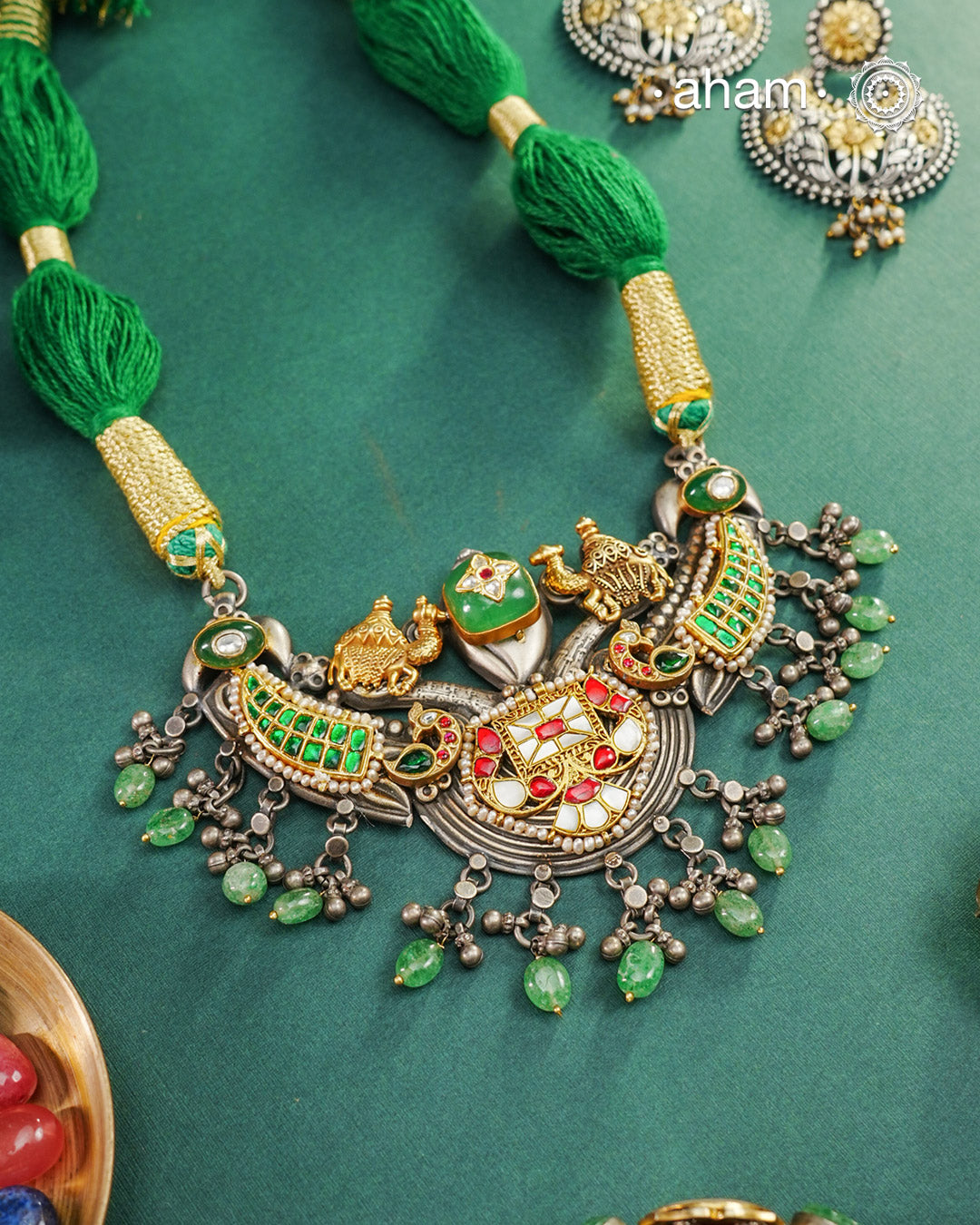 One of a kind statement wearable art pieces. An eclectic mix of elements, with a play of colours, textures, forms and workmanship. Crafted in Silver with two tones and kundan highlights and beautiful stones that makes this neckpiece so versatile and unique. Modern Heirloom pieces that can be worn across generations.