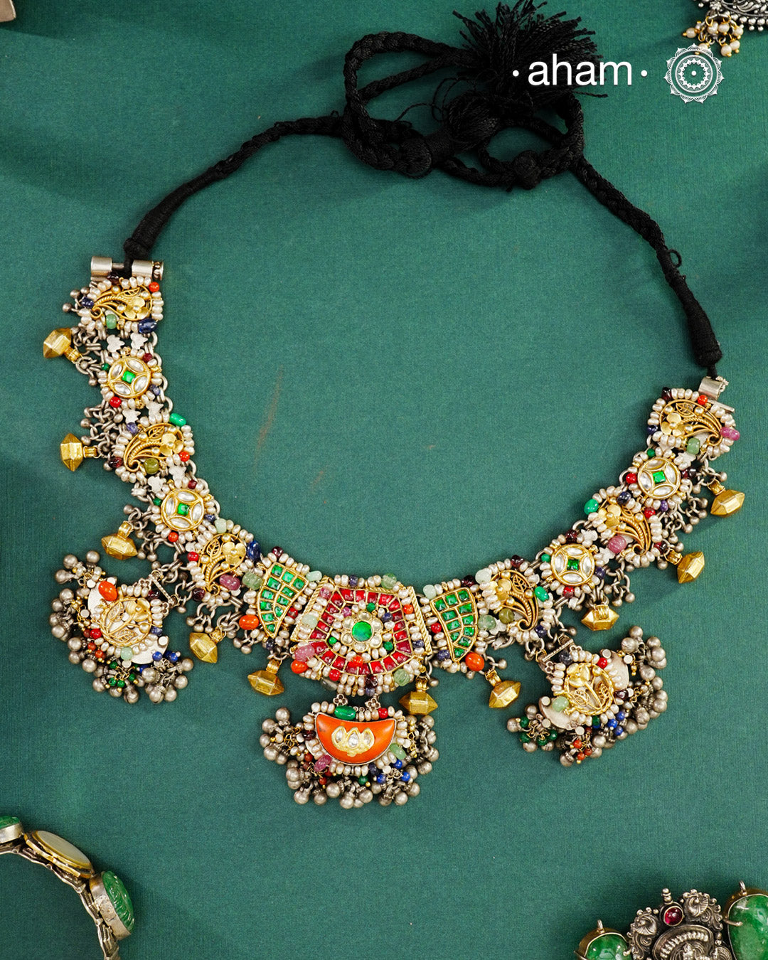 One of a kind statement wearable art pieces.An eclectic mix of elements, with a play of colours, textures, forms and workmanship. Crafted in Silver with two tones and kundan highlights and beautiful cultured pearls that makes this neckpiece so versatile and unique. Modern Heirloom pieces that can be worn across generations.