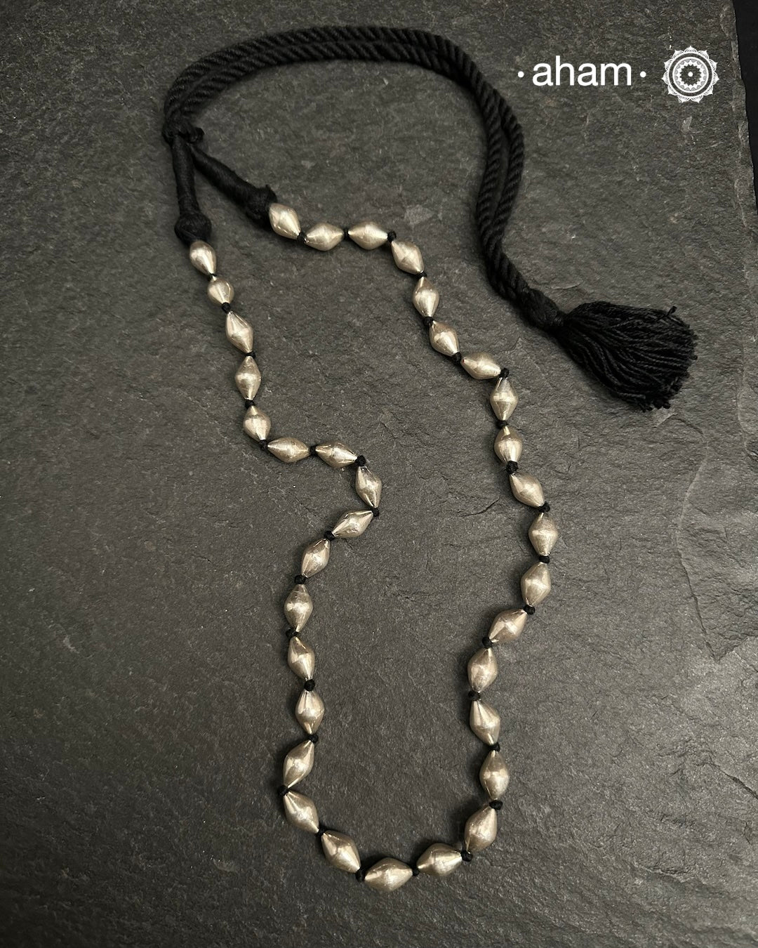 Silver Dholki/ Wax Beads coated with silver foil with black adjustable thread. Also known as Bor Mala
