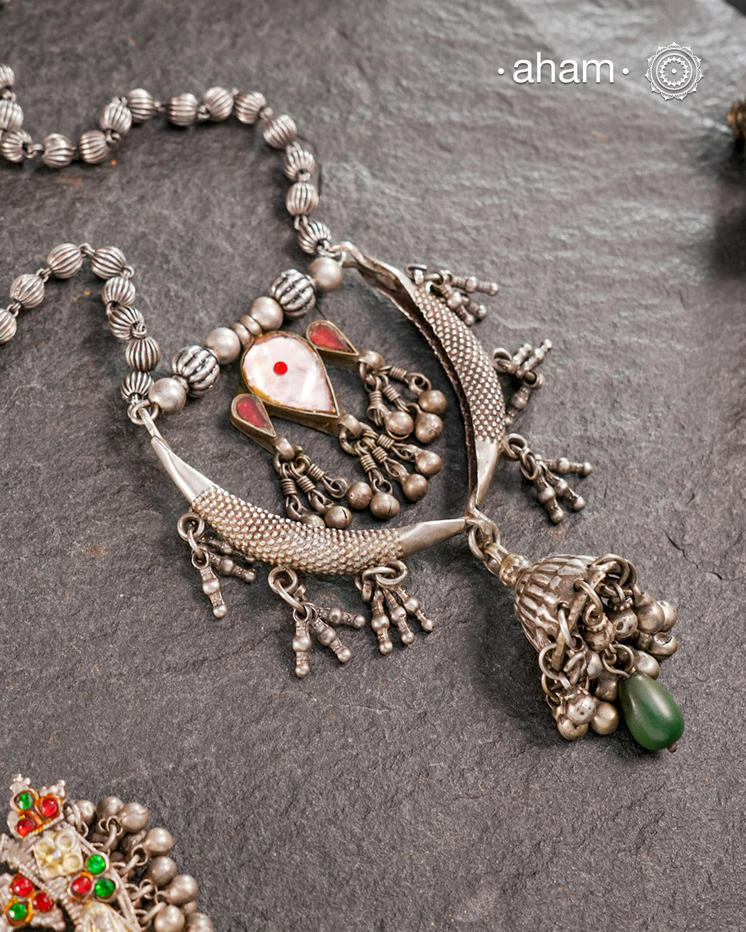 A few vintage assorted silver pieces including an old Chandbali, a jhumkie and glass piece put together to make this unique pendant with a beautiful textured silver ball chain. One of a kind unique pieces.