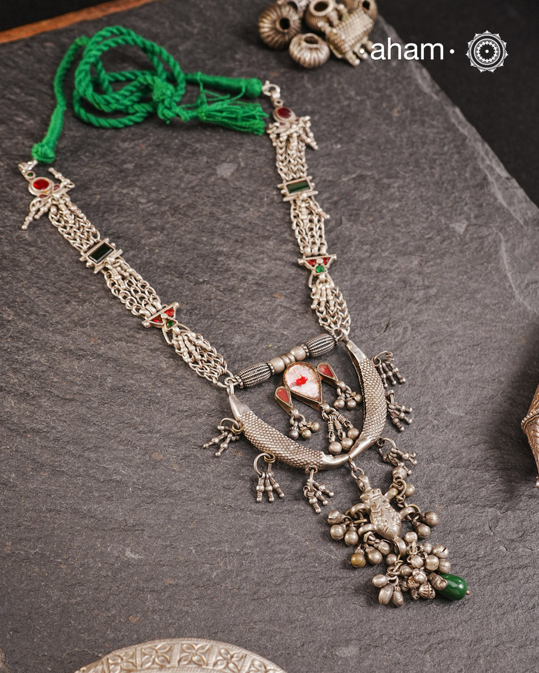 Tribal silver neckpiece handcrafted by threading together multiple tribal . This necklace truly exemplifies the continuity of the traditional prototypes.