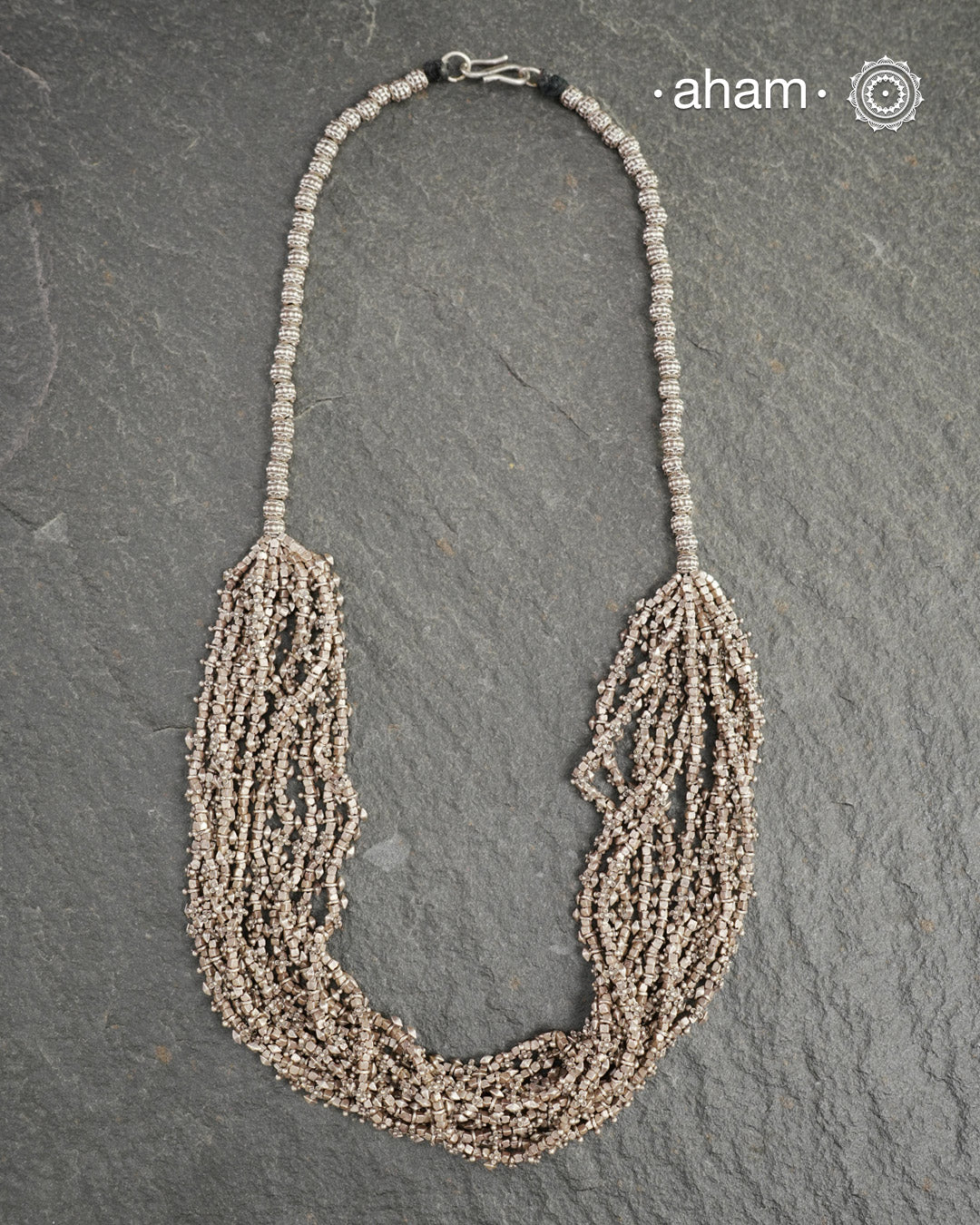 Featuring multiple strands of delicately crafted rice- (Dhaan) and mustard- (Sarson) shaped silver beads, this neckpiece reflects the cultural traditions of the Kutia Kondh tribals of Odisha, for whom these forms represent prosperity, fertility, and abundance.