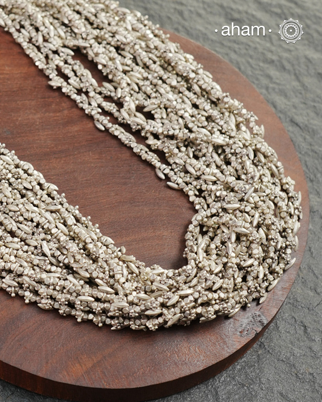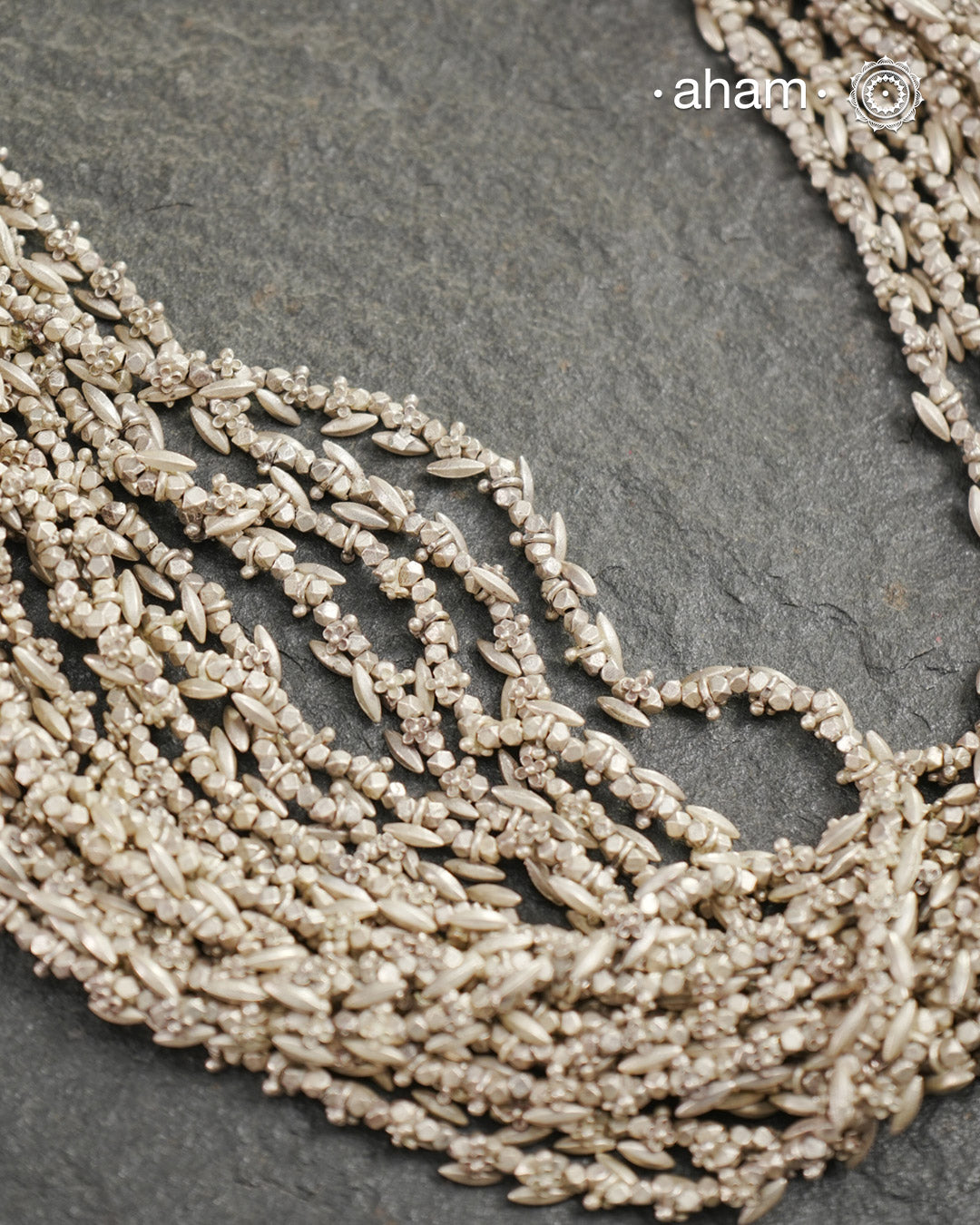 Featuring multiple strands of delicately crafted rice- (Dhaan) and mustard- (Sarson) shaped silver beads, this neckpiece reflects the cultural traditions of the Kutia Kondh tribals of Odisha, for whom these forms represent prosperity, fertility, and abundance.