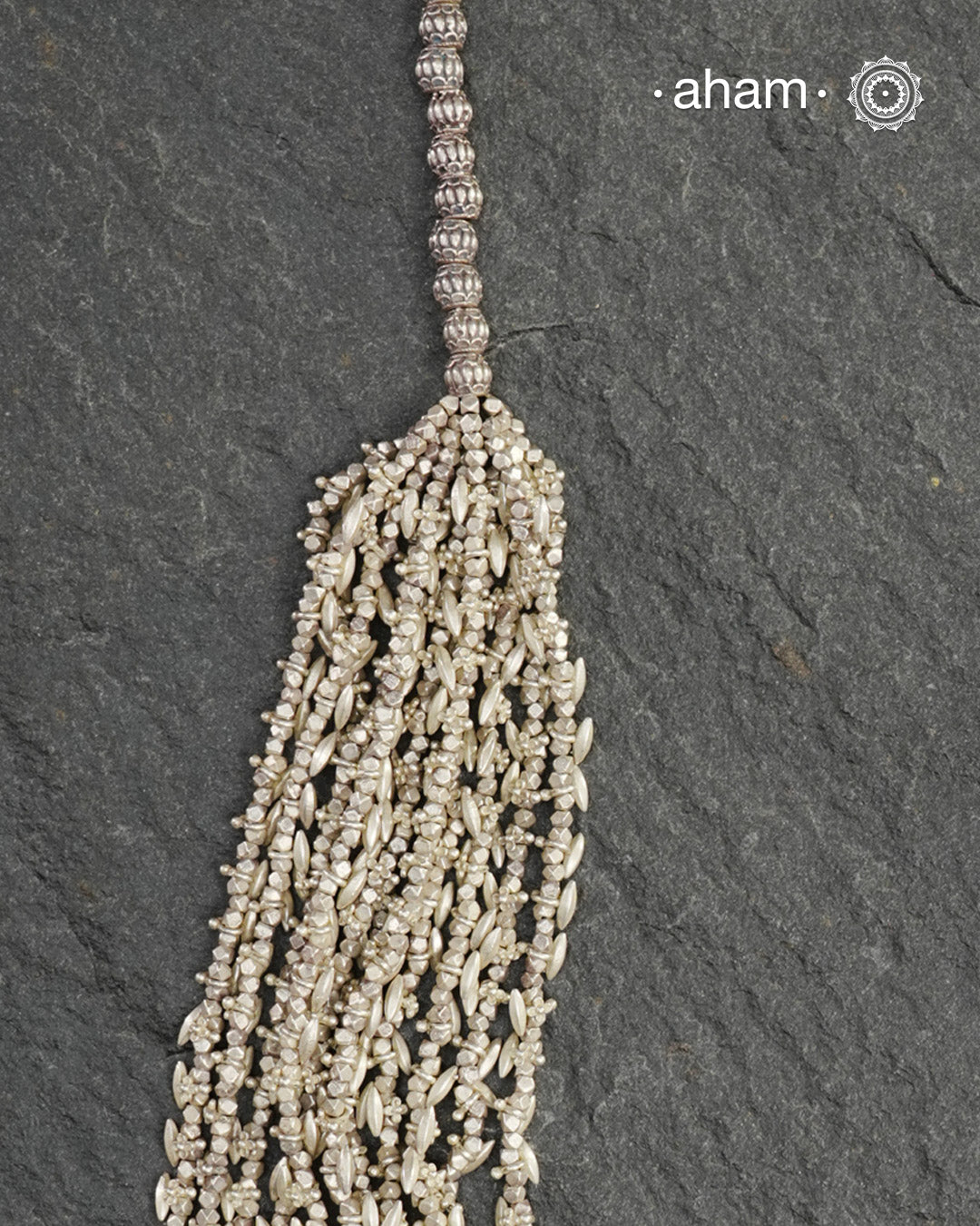 Featuring multiple strands of delicately crafted rice- (Dhaan) and mustard- (Sarson) shaped silver beads, this neckpiece reflects the cultural traditions of the Kutia Kondh tribals of Odisha, for whom these forms represent prosperity, fertility, and abundance.