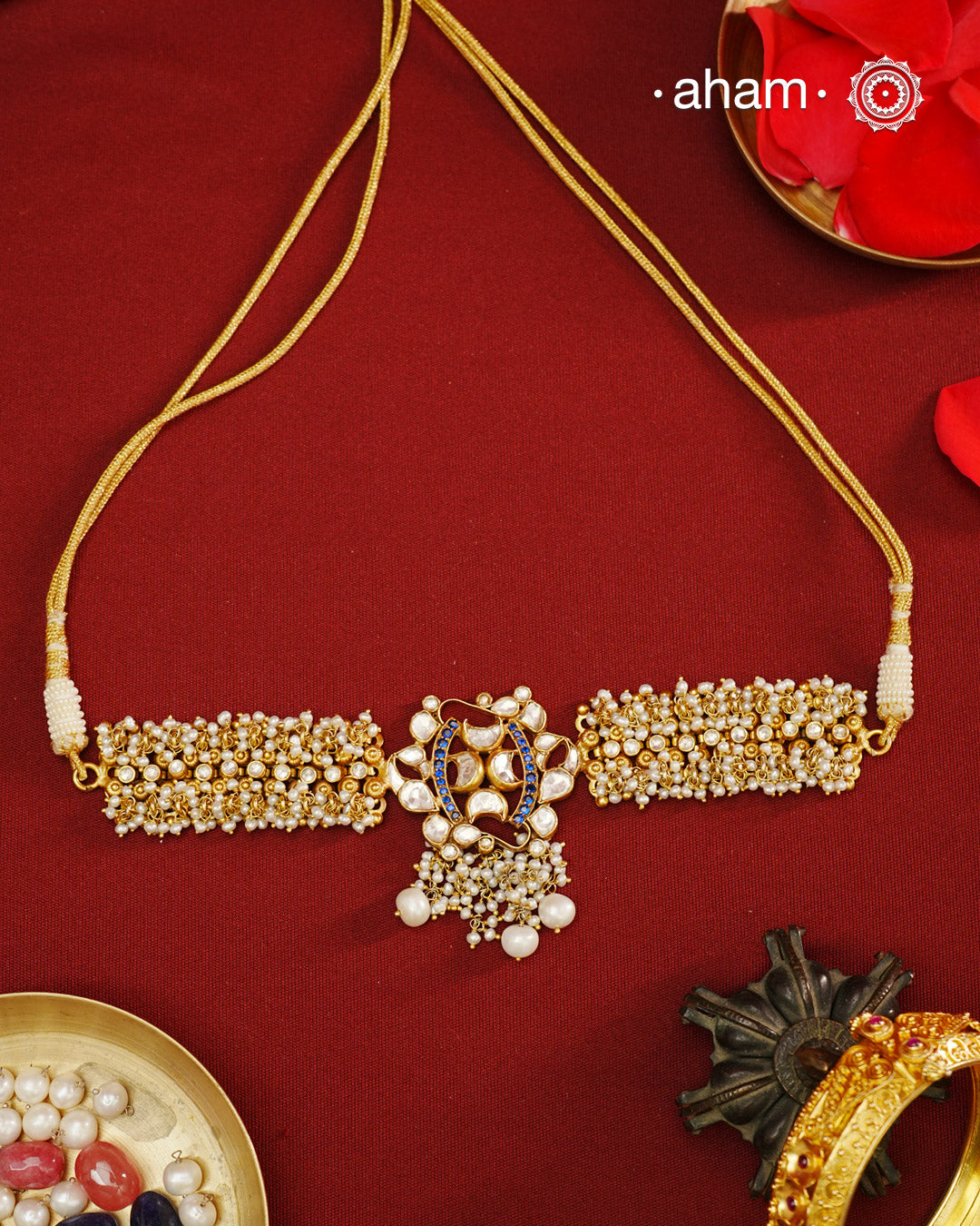 Elevate your traditional ensemble with this exquisite kundan and pearl choker set, meticulously handcrafted in silver with luxurious gold polish. The intricate kundan work showcases vibrant blue stone accents that add depth and sophistication to the design. Paired with lustrous pearls, this neckpiece exudes timeless elegance and refined craftsmanship. The matching earrings echo the same aesthetic, ensuring a cohesive, polished look. Perfect for weddings, festivals, or special occasions, this set combines heritage artistry with contemporary styling.